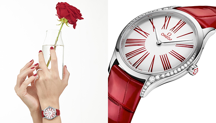 تزداد مجموعة OMEGA Trésor روعة اليوم بعدما أطلقت Omega إصداراً فريداً يجمع بين اللونين الأحمر والأبيض. تتّسم الساعة الجديدة بميناء أبيض يضمّ أرقاماً رومانيّة حمراء كبيرة، وتحتضنه علبة فولاذيّة بقطر 23 ملم مرصّعة بـ 38 ماسّة، فضلًا عن ماسّة إضافيّة محاطة بزهرة من السيراميك الأحمر مستوحاة من شعار Omega. وتكتمل اللمسات الجماليّة للساعة الجديدة مع حزام أحمر من الجلد يزيدها فرادة وجمالًا.