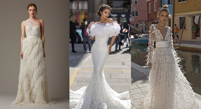 كثيرة هي الصيحات التي يعتمدها مصمّمو الأزياء عند تصميم فساتين الزفاف، ومن بينها الريش الذي شكّل صيحة رائجة هذا الموسم. فقد طغى على كثير من فساتين الزفاف، لتتميّز العروس بإطلالة أنثويّة راقية ولافتة. وقد زيّن الريش فساتين الزفاف بأسالسب عدّة، فأتى إمّا إمّا متناثرًا بأسلوب بسيط، أو غطّاه بأكمله أو بجزء منه. وقد لفتتنا أيضًا فساتين الزفاف التي تزيّنت أكتافها بعدد كبير من الريش. لا تتردّ>ي في اعتماد فستان الزفاف المزيّن بالريش في زفافك، فهو سيزيدك رونقًا، فخامةً، وجاذبيّة!