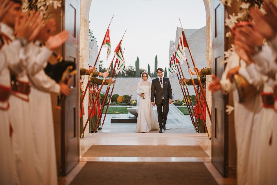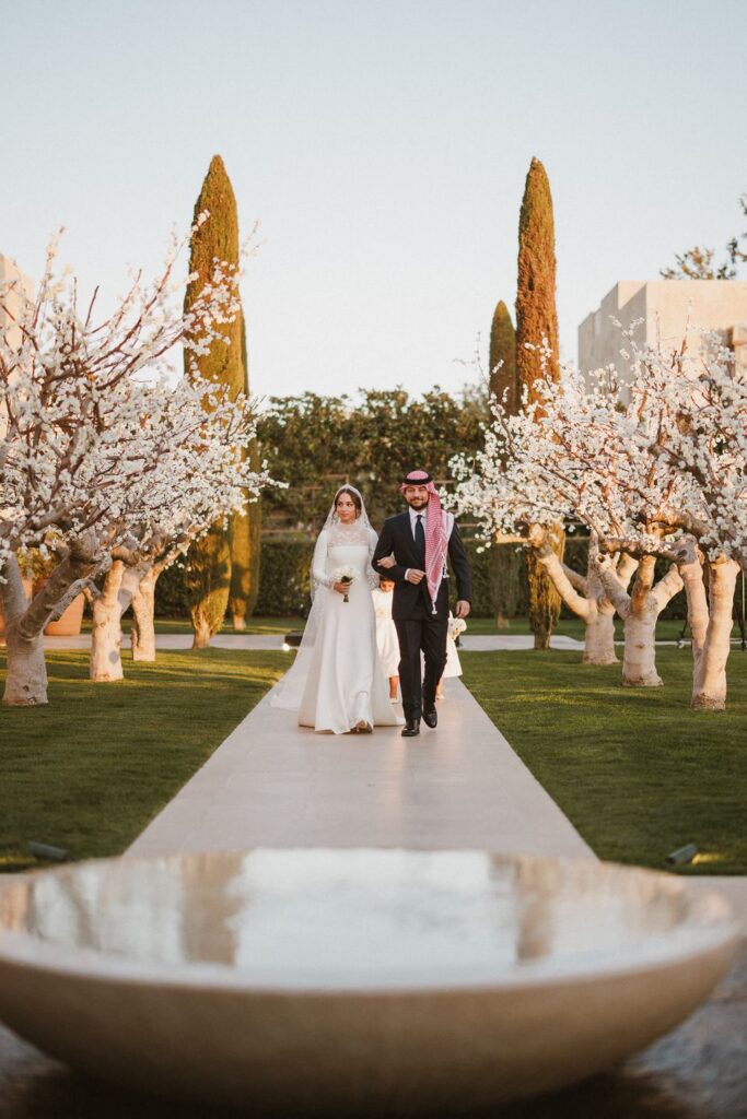 وقد تألقت الأميرة إيمان بإطلالة بسيطة وناعمة بفستان أبيض مطرّز ذي ياقة عالية وأكمام طويلة وتفاصيل جذابة من الدانتيل، مرفق بذيل طويل مطرّز بالأزهار، واعتمرت تاجاً فاخراً من الماس كانت قد أهدته لها والدتها الملكة رانيا في حفل الحناء الذي أقيم قبل أيام في قصر الحسينية ضمن أجواء عكست التقاليد والهوية الوطنية الأردنية بامتياز سواء من خلال الأغاني أو الأهازيج أو الأغاريد أو حتى الفرقة النسائية الأردنية المشاركة في الحفل والنساء المشاركات من مختلف محافظات المملكة والأثواب الأردنية التي أظهرت النسيج والتصميم الأردنيين.