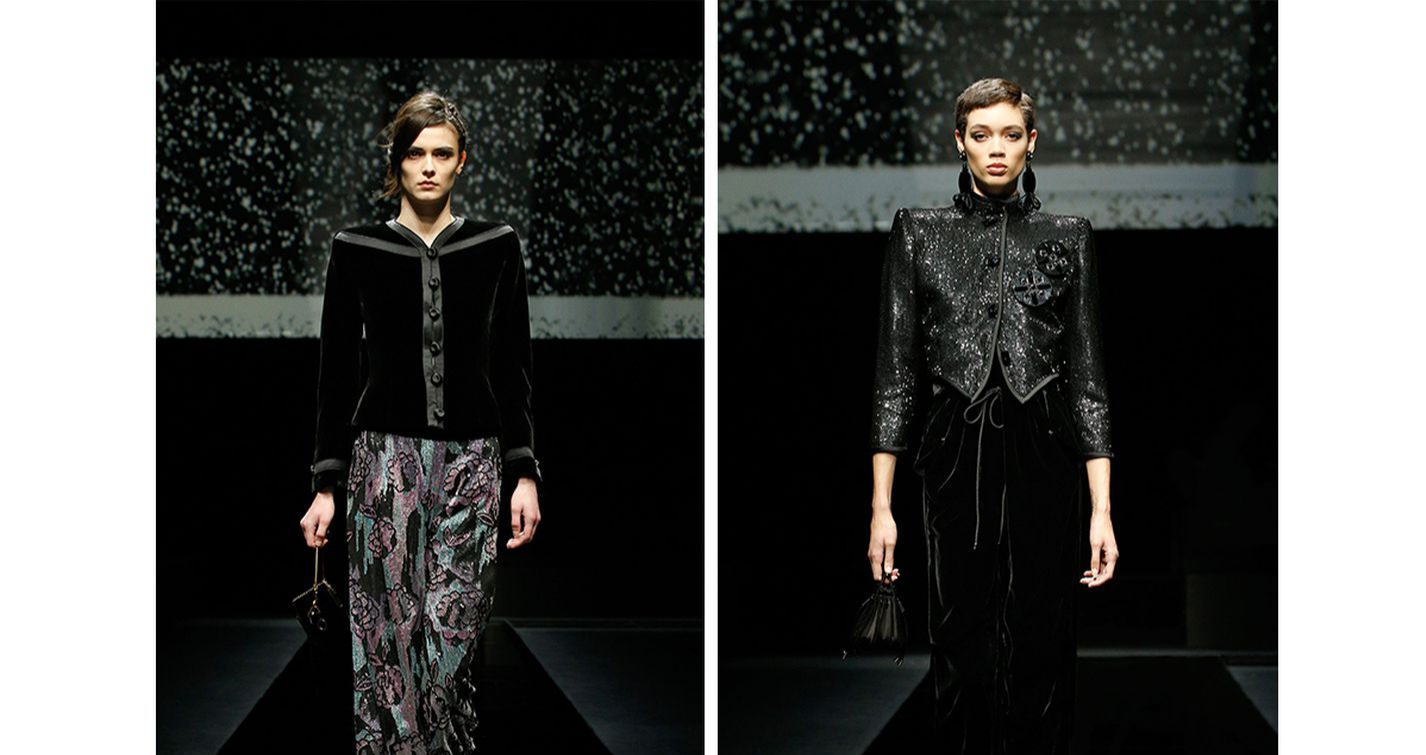 أطلقت دار جورجيو ارماني- Giorgio Armani مجموعتها لخريف وشتاء 2020 2021، فكشفت عن تصاميم في غاية التميّز، إلّا أنّ لم يتمكّن أحد من حضوره بسبب إصدار الدار بيانًا عن عرض مجموعتها من دون مشاركة مدعوين خوفًا من تفشّي فيروس كورونا الذي رُصد في العديد من المدن الإيطاليّة. لذلك، بثّت العرض مباشرة عبر موقع Armani.com وحساباتها على إنستغرام وفايسبوك. طغى المخمل بشكل كبير على المجموعة التي ضمّت تصاميم أنثويّة أنيقة وفخمة من القمصان الواسعة وخيارات البلايزر والتنانير والمعاطف والسراويل الواسعة، والتي ازداد بعضها روعة وحيويّة مع نقشات الأزهار وبتلاتها.