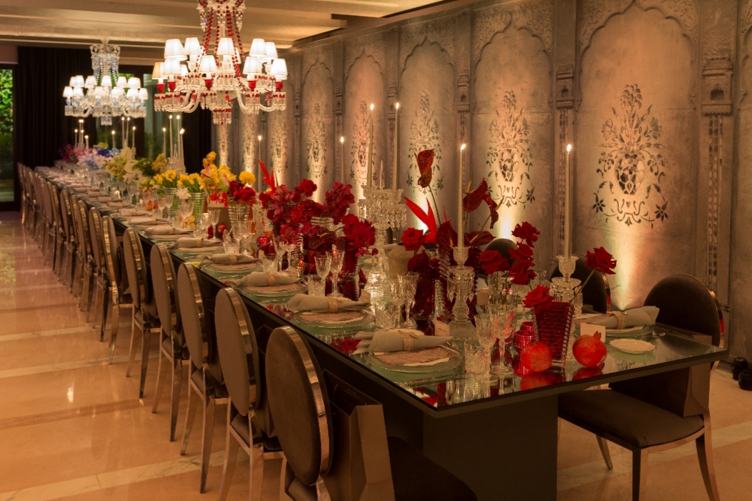 أما طاولة العشاء فكانت مرصعة بقطع بلورية براقة من باكارات ازدادت جمالاً بفضل ألوان متدرجة كانت متناسقة تماماً مع باقات الزهور المذهلة.