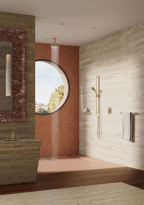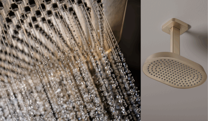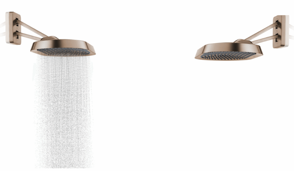- المنتج الرئيسي: دش جداري ذو نفاثتين مزوّد بذراع قابل للتعديل، ما يتيح توجيه الرذاذ الغني بدقة نحو دش مائل مخصص للأماكن المفتوحة (walk-in shower)، ليعمل كدش علوي وعلى مستوى الكتفين في آنٍ واحد.