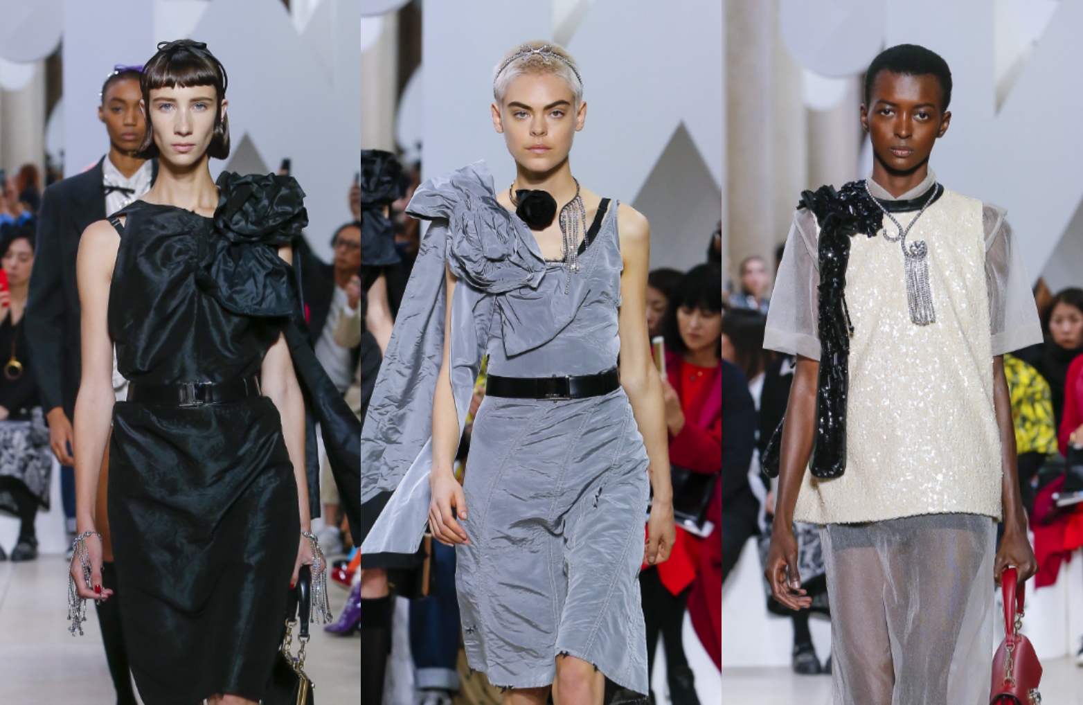 تنوع القمشة كان لافتًا عرض ازياء ميو ميو (Miu Miu) لبريع وصيف 2019، فقد برزت السترات والمعاطف والتنانير والفساتين المصنوعة بألوان متعددة من الجلد، تنوعت بين البني والسود والبيج والكحلي وغيرها. وقد كان للأقمشة الشفافة حضور بارز، إذ ظهرت كتنورة فوق الشورت، وكذلك الجينز الذي حاكت منه العلامة تصاميم رائعة للتنانير والفساتين الطويلة والقصيرة. أقمشة أخرى جسّدت براعة الدار في التصميم، وخصوصًا تلك التي أتت مزينة بورود وعقدات كبيرة عند الكتف أو الخصر. غليكِ في ما يلي أبرز التصاميم التي لفتتنا: