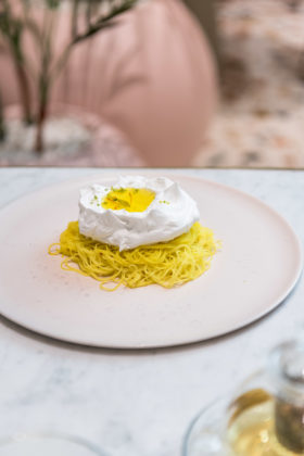 أما أطباق الغداء فتشمل حساء الفطر والكمأة الذي يشكل أفضل طبق مقبلات مع سلطة التمر والكلماري المقرمش وجبنة بوراتا والفيتا المطبوخة الشهية التي تُقدم مع صلصة طماطم حامضة. هذا إلى جانب الضلوع المنقوعة لمدة 24 ساعة على الطريقة الكورية والمطبوخة على نار هادئة لتكون طرية وغنية بالعصارة. أما الأطباق الرئيسية فمنها السلمون المقرمش والجمبري المشوي لمحبي ثمار البحر، في حين أنّ الضيوف الذين يفضلون الأصناف الكلاسيكية سيستمتعون حتماً بطبق معكرونة بينّيه بالدجاج والأعشاب وطبق الرافيولي الوردية.