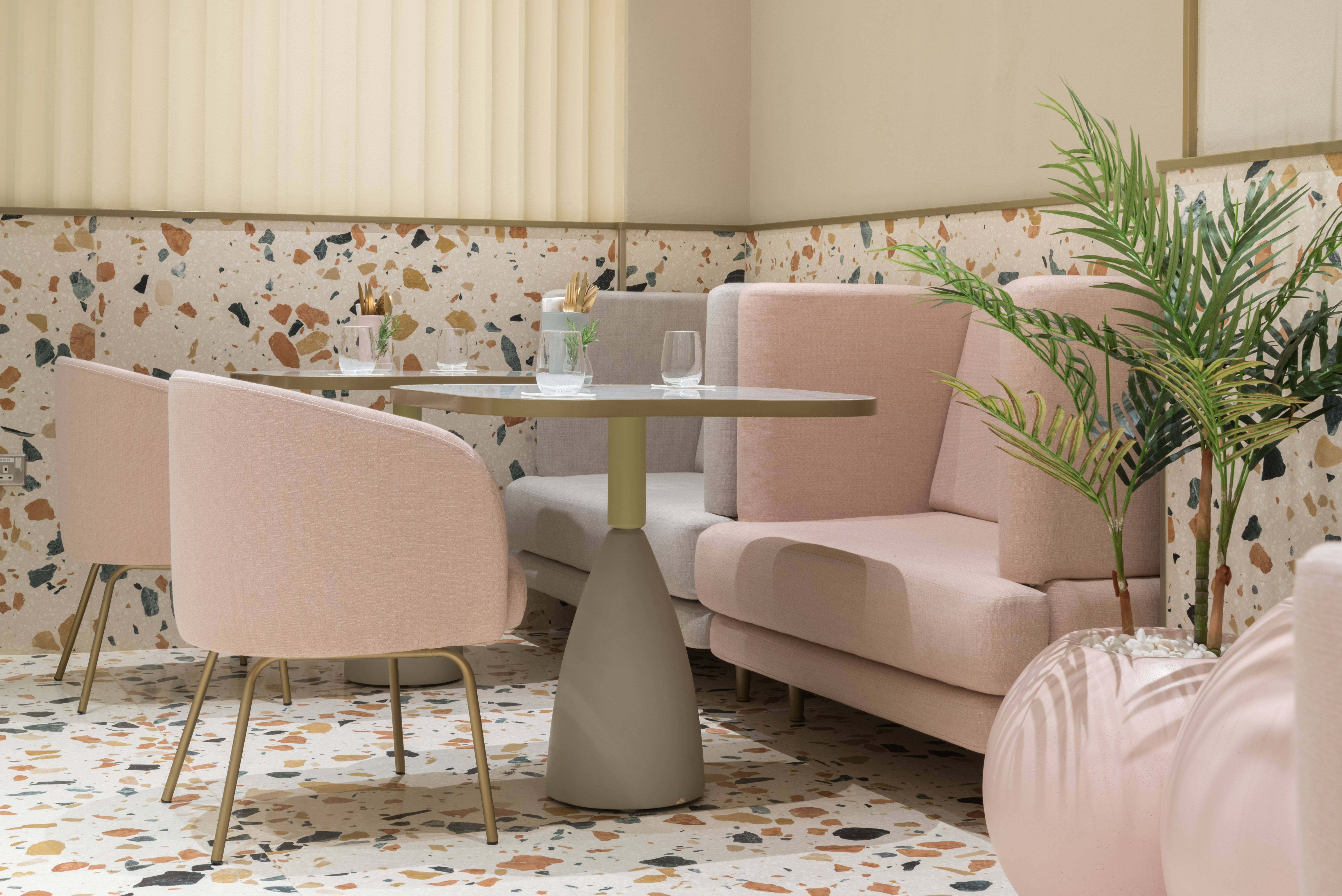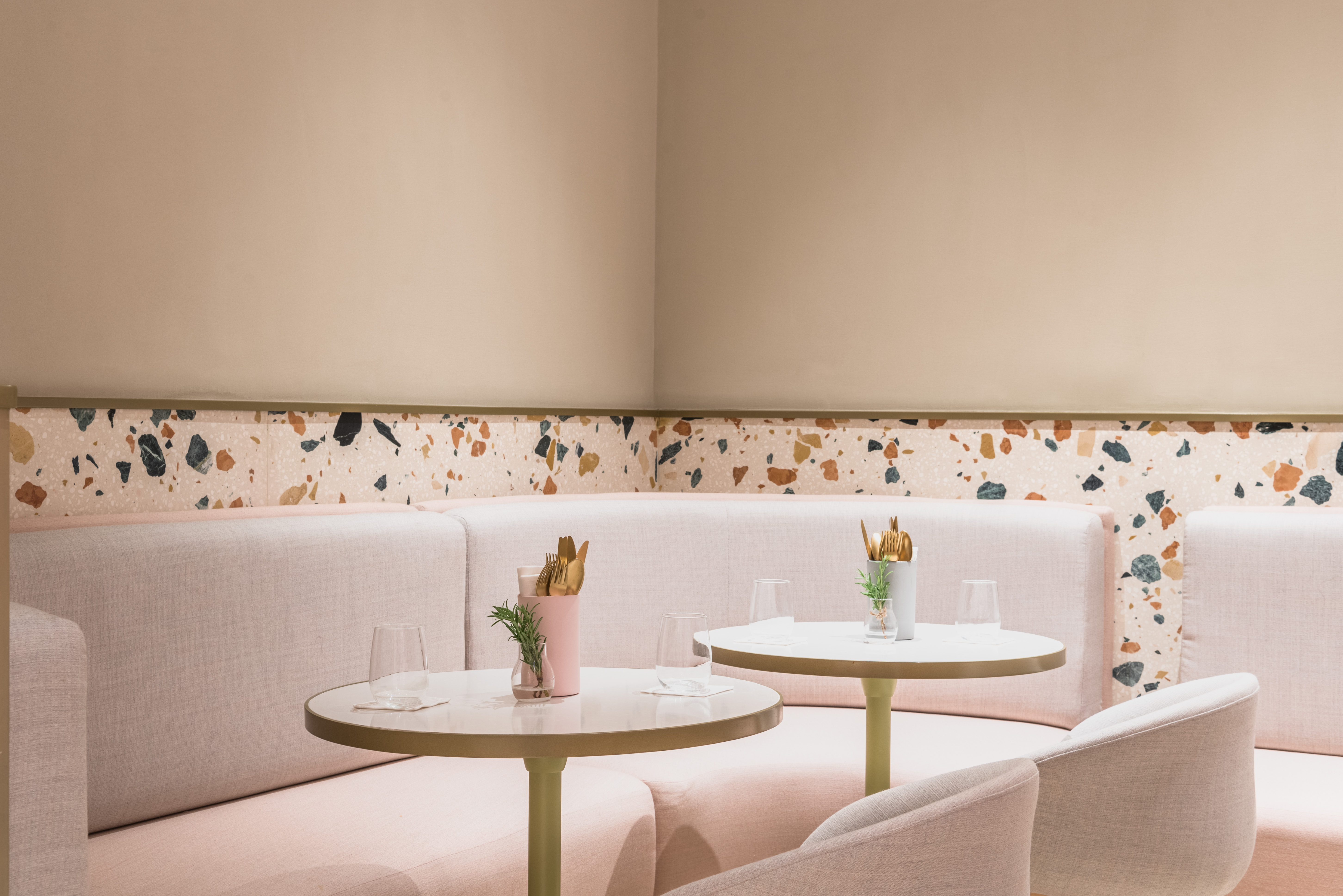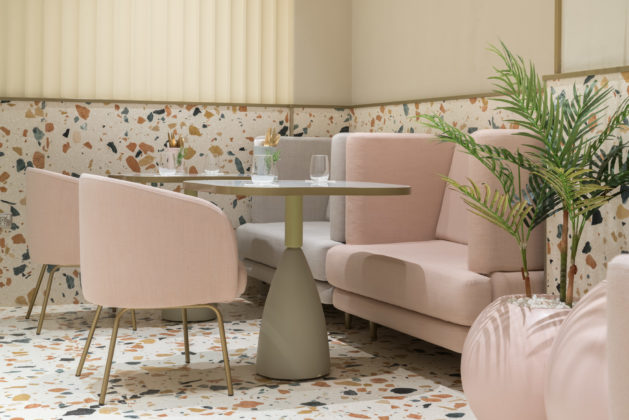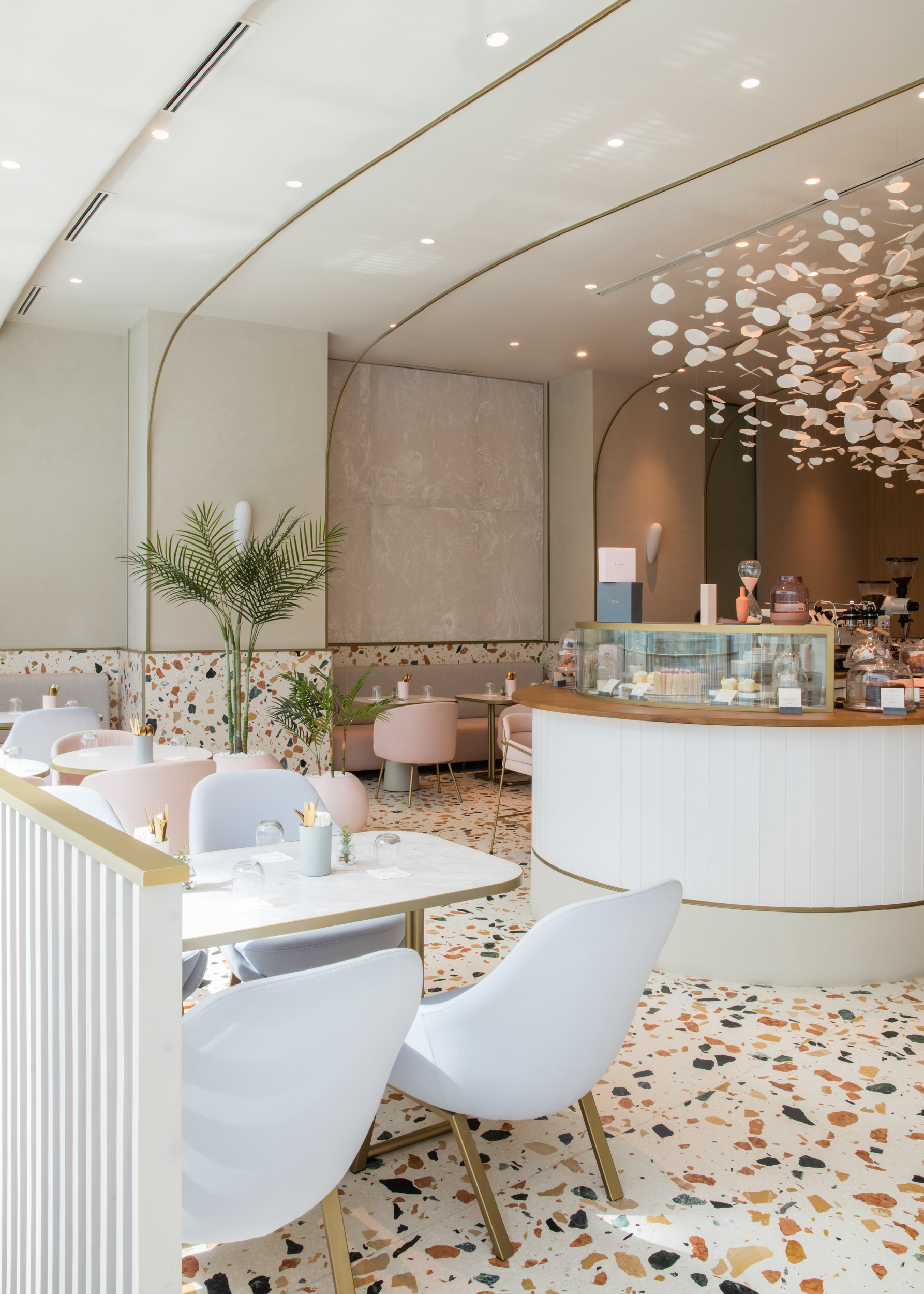 بفضل تدرجات الألوان الناعمة، يبدو المكان فسيحاً، ويمكن الشعور بمدى وسعه بدءاً من التفاصيل الإنشائية وصولاً إلى قطع الأثاث المختارة. وعلى سبيل المثال، يضفي بلاط تيرازو الإيطالي الاستثنائي لمسة منعشة ورقيقة على المساحة الداخلية، في حين أنّ الرخام الأبيض والتفاصيل النحاسية الصفراء تمنحه أناقة تتجاوز حدود الزمان والمكان. أما البتلات المضاءة عند البار في الوسط فتعكس الجانب المتناسق من التصميم لأنّ الهدف منها يكمن في تصوير الأوراق وهي تتساقط بسبب الهواء، وهي فكرة توحي باستمرارية سلاسة التصميم الذي يشكل وحدة واحدة في كل لحظة من لحظات التجربة المميزة في مطعم “تو في سيمفوني”.