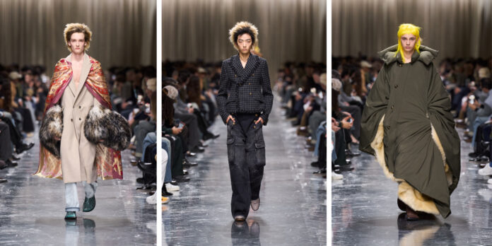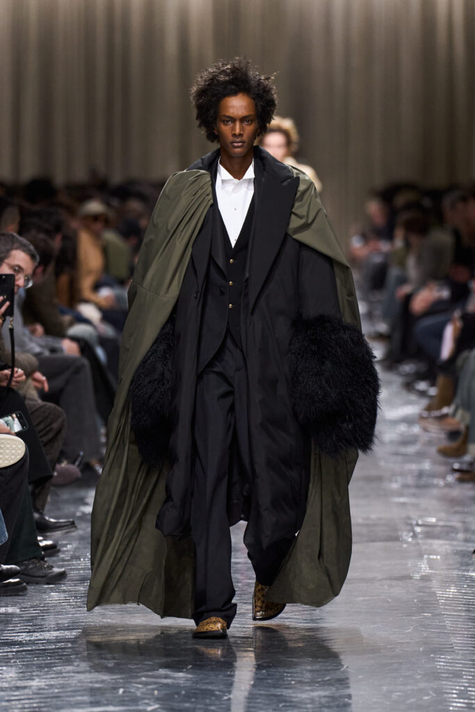 تتآلف أقمشة تويد “دونيغال” مع المخمل بلمعانه الغني وحبك الجاكار المشرق وتتعزّز بتطريزات برّاقة وأهداب كثيفة وزخارف نسيجيّة، لتشكّل سردًا بصريًا–حسيًا غير مألوف، فيما تبقى لوحة الألوان قاتمة ومتحفّظة. أما الأكسسوارات، فتكمّل هذا التوازن عبر أحذية برباط أمامي وكعب منخفض، وأحذية لوفر بتفصيل على شكل الحرف “دي” D، وحقائب “مسنجر” ناعمة.