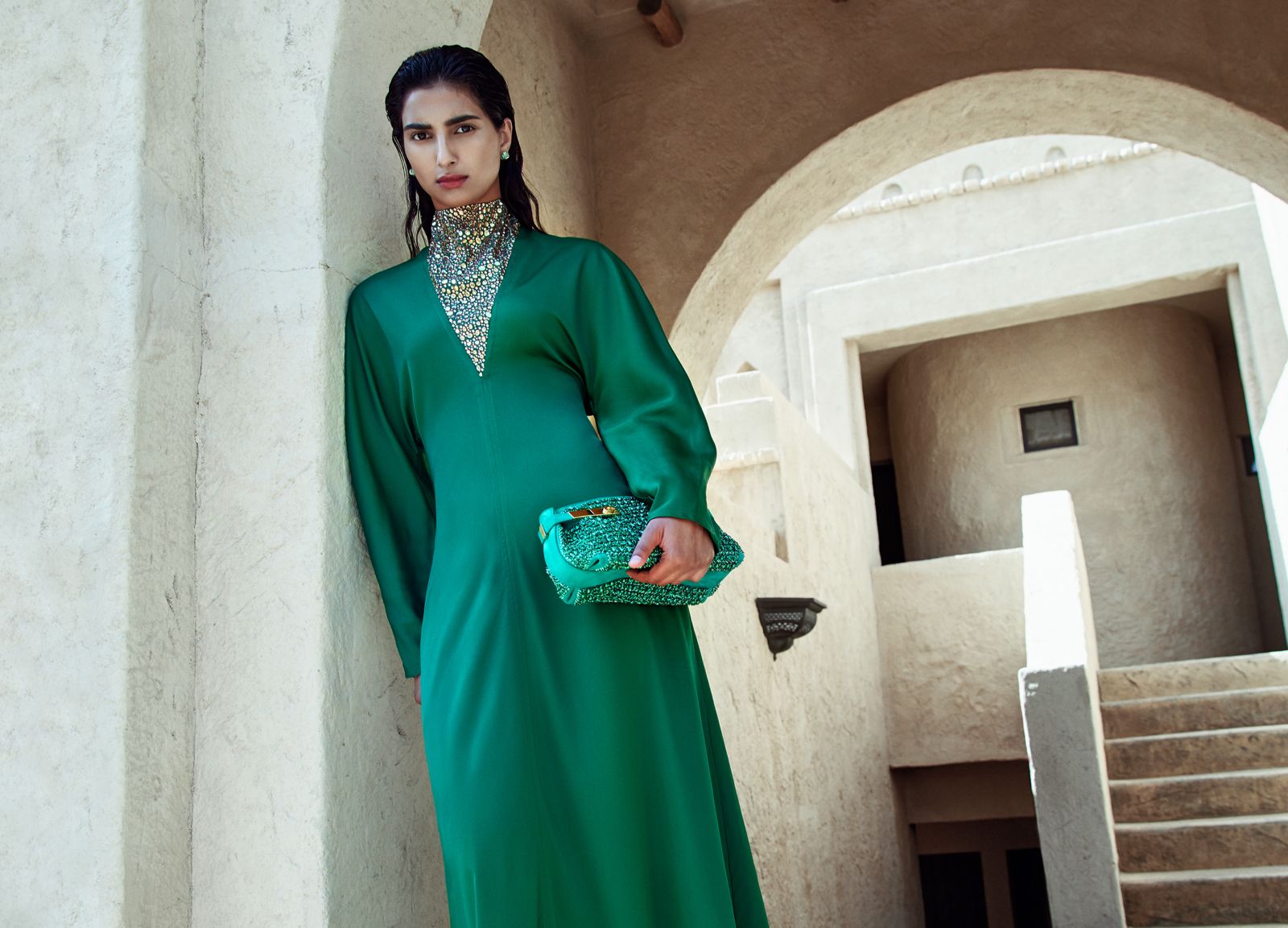 استكملي إطلالتك بأقراط مرصعة بالستراس الزمردي على النحاس الذهبي أو ستراس أسود على الروتينيو – كلها تفاصيل ناعمة ومذهلة لتعزيز أناقتك.