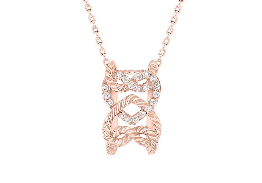 تتّصل “العقدة الكلاسيكية” لداماس بحبل من الذهب 18 قيراط، ، وتزيّنها ألماسة واحدة بلمسة أنيقة ومزخرفة كرمز للوحدة الخالدة واللانهائية. حقًا إنّها قطعة أبدية بلفتة رومانسية بسيطة ورقيقة.