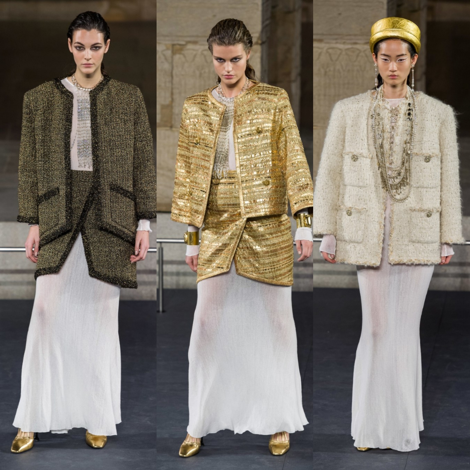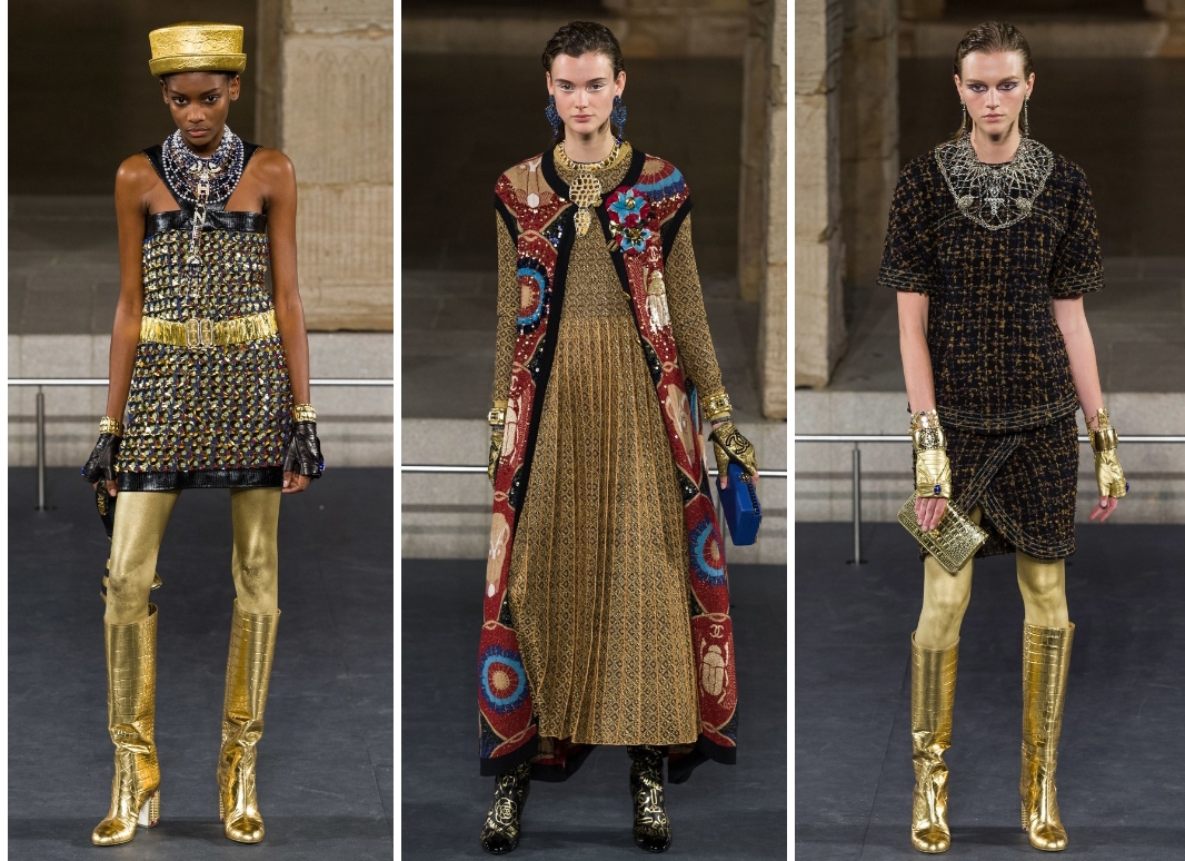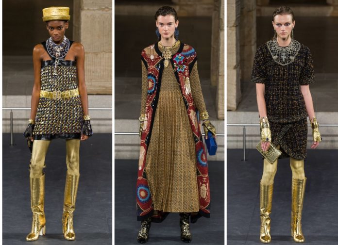 من الحضارة المصرية القديمة، استوحى كارل لاغرفيلد، المدير الابداعي لدار شانيل (Chanel) المجموعة التحضيرية لخريف ٢٠١٩، فكانت تصاميم مميزة اتسمت بقصاتها الجميلة. فالفساتين والسترات أتت بوحي من ملابس كليوباترا والرجال المصريين القدامى، والألوان أيضًا إذ ظهرت بتدرجات مثل الذهبي والزيتي اللامع. أما الأقمشة فتنوعت وبالطبع لم يغب التويد الذي بات أيقونيًا في تصاميم شانيل. وقد تزينت الملابس بتفاصيل جميلة، مثل المعادن والتطريزات لمزيد من اللمسات الحيوية والفخمة. وفي الأكسسوارات، أحزمة وقبعات وأحذية تصل إلى حدود الركبة وغيرها، لتتميز المرأة بإطلالة مثالية.