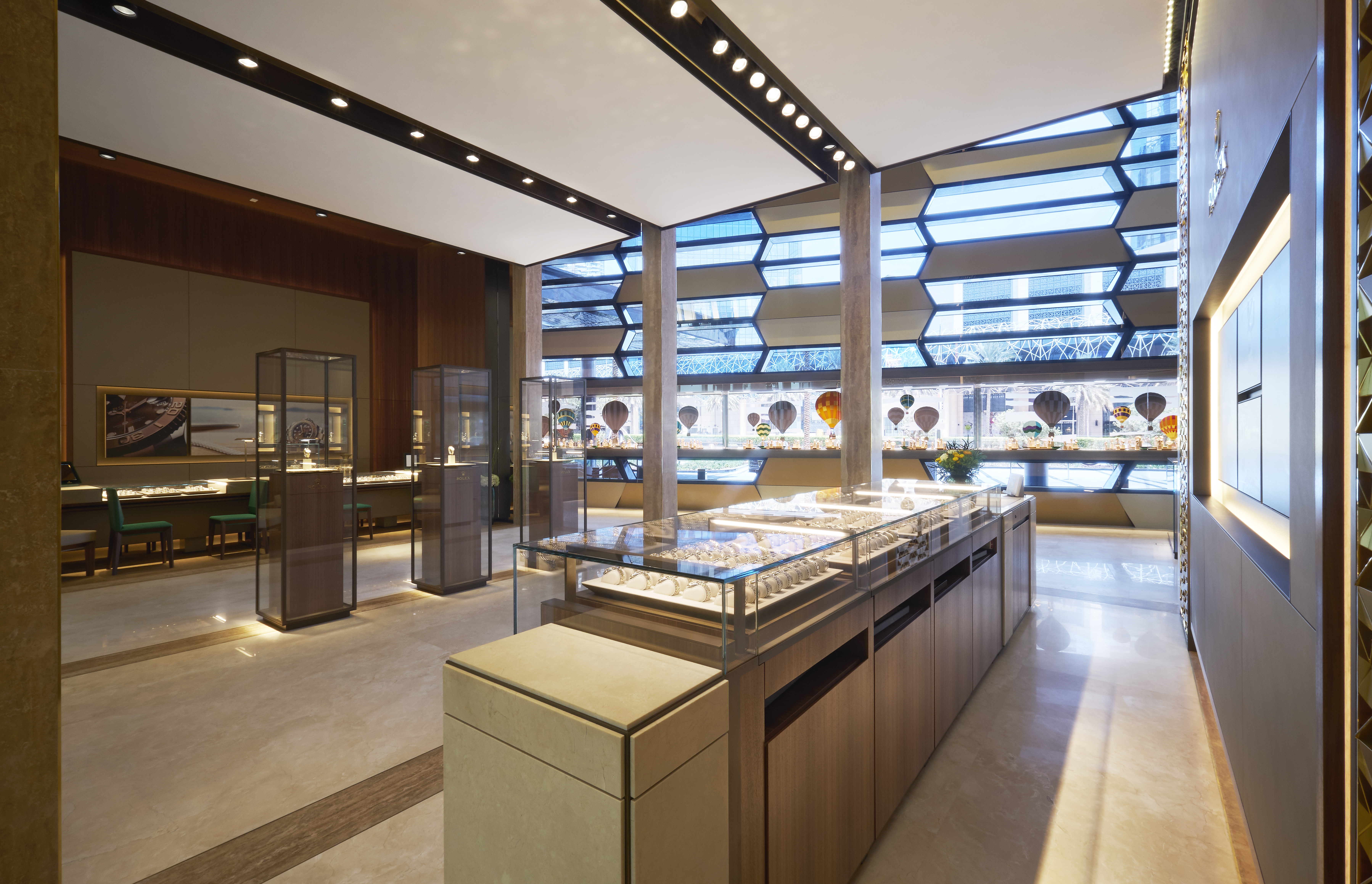 يحافظ الطابق الأرضيّ من المتجر على التقاليد المتّبعة في متاجر ROLEX العالميّة من حيث منصّات البيع والطاولات وتشكيلات الساعات المعروضة. ويقدّم طيفاً واسعاً من أشهر إبداعات العلامة لتلبّي كل الأذواق والمتطلّبات. أما الطابق الثاني، أي الميزانين، فيمكن مشاهدتها من الطابق الأرضي، وهي مجهزة بمصعد يتيح الوصول إليها. وتزهو هذه المنطقة الحصريّة بديكورات خلّابة يبرز فيها مثلاً جدران مزدانة بتفاصيل أنيقة من الجلد مع زخارف نباتيّة ذهبيّة اللون، مع صور مستوحاة من قطع الماس أو التيجان المميّزة لساعات العلامة والمبتكرة من مؤشرات الزمن الّذهبيّة والتفاصيل المطرّزة في ساعاتها.ويتيح الطابق العلويمن المتجر تجربة تسمح للزوّار باكتشاف تاريخ العلامة وعالمها الساحر. فيأخذ الزوّار برحلة من دبي إلى جنيف للتعرّف على تراث ROLEX ، ساعاتها، آليات تصنيعها، شهاداتها، عقود رعايتها وأنشطتها الخيريّة.