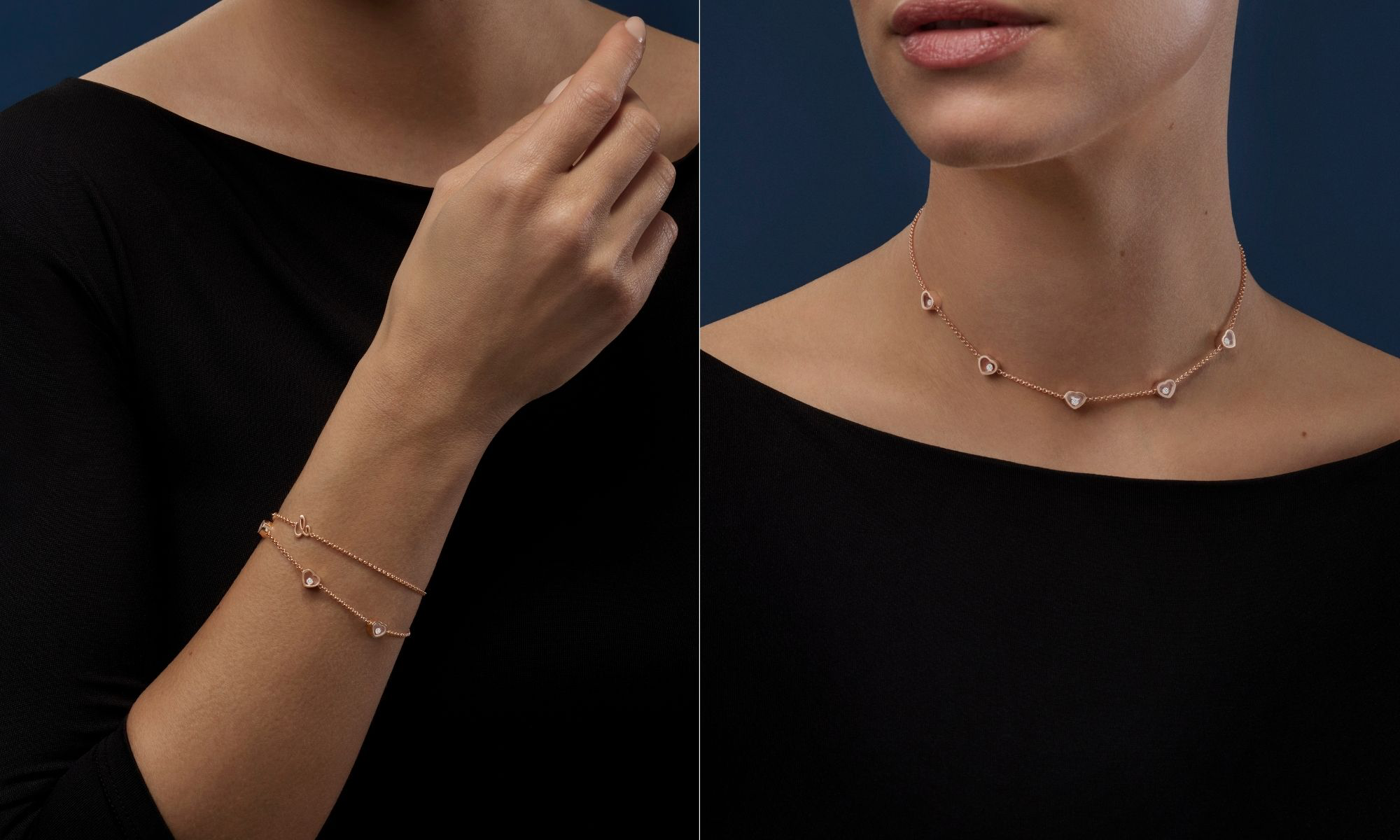 تقدم دار شوبارد مجموعة جديدة بالكامل تضم طوقين تزينهما قلوب رقيقة مصنوعة من الذهب الأخلاقي عيار 18 قيراط مع الألماسات المتراقصة، استوحي تصميمهما من أشهر رموز التصميم لإبداعات الدار الشهيرة المتمثلة في شكل القلب والألماسات المتراقصة. لتثري بذلك دار شوبارد، بالتعاون مع شركائها في شركة أحمد صديقي وأولاده، مجموعة (My Happy Hearts) بإصدار خاص بدولة الإمارات العربية المتحدة تقدم فيه أحدث إبداعاتها العصرية المتمثلة في هذين الطوقين الجديدين.
