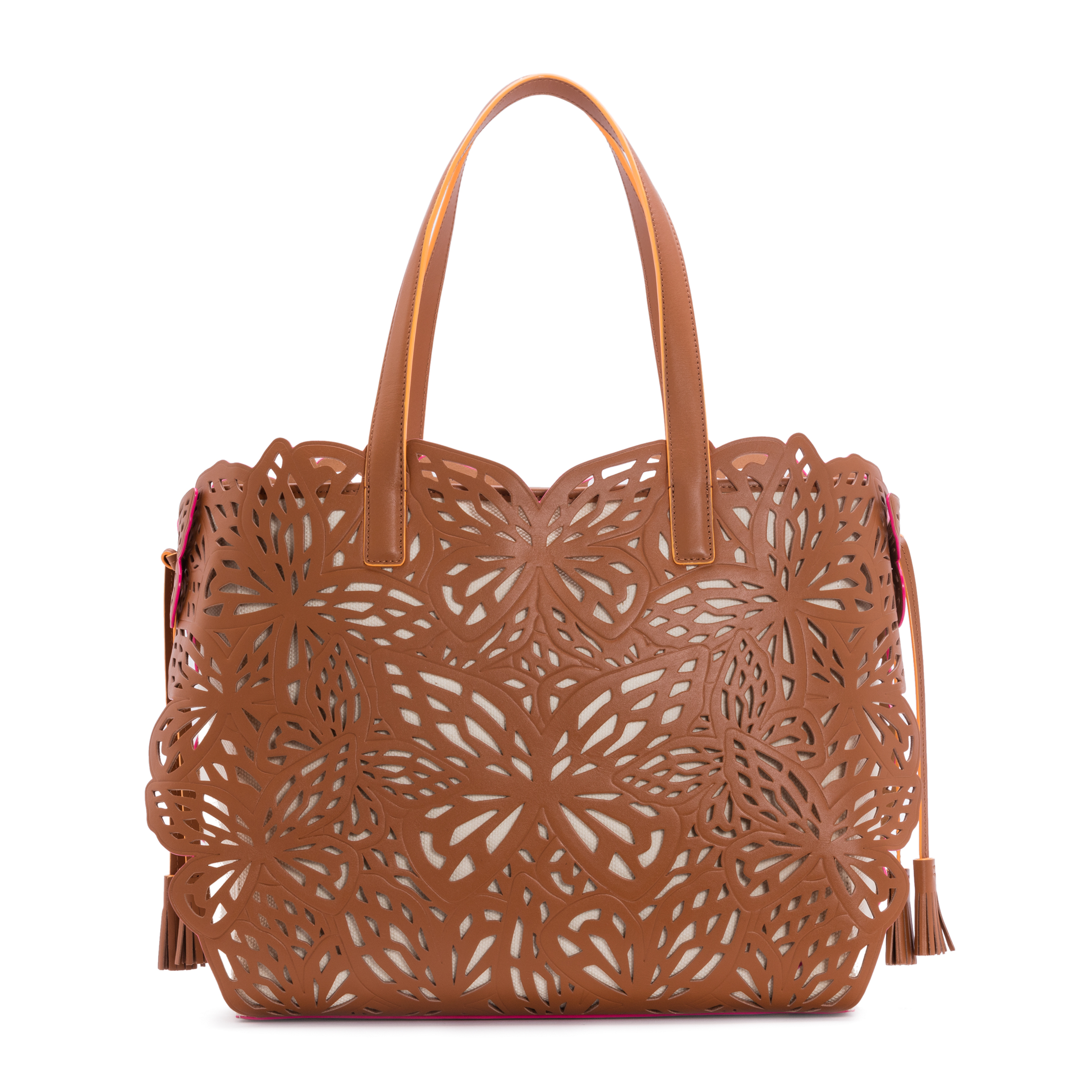 مع شرّابة المطرّزة بالخرز والمصنوعة من الساتان باللونين الأخضر الزيتوني (Chartreuse) والوردي المشعّ.
