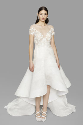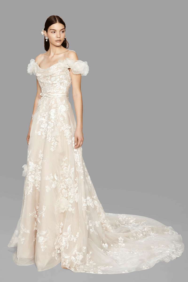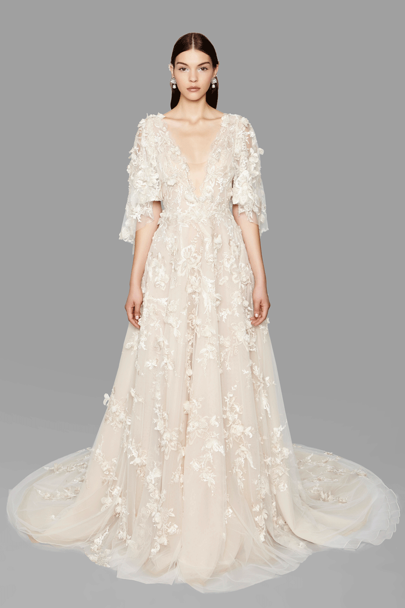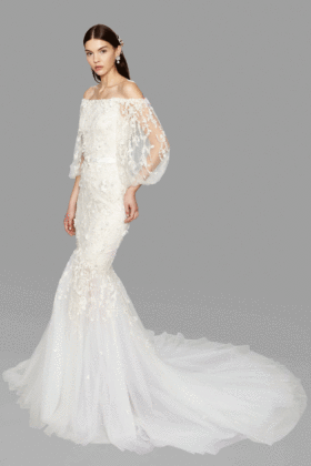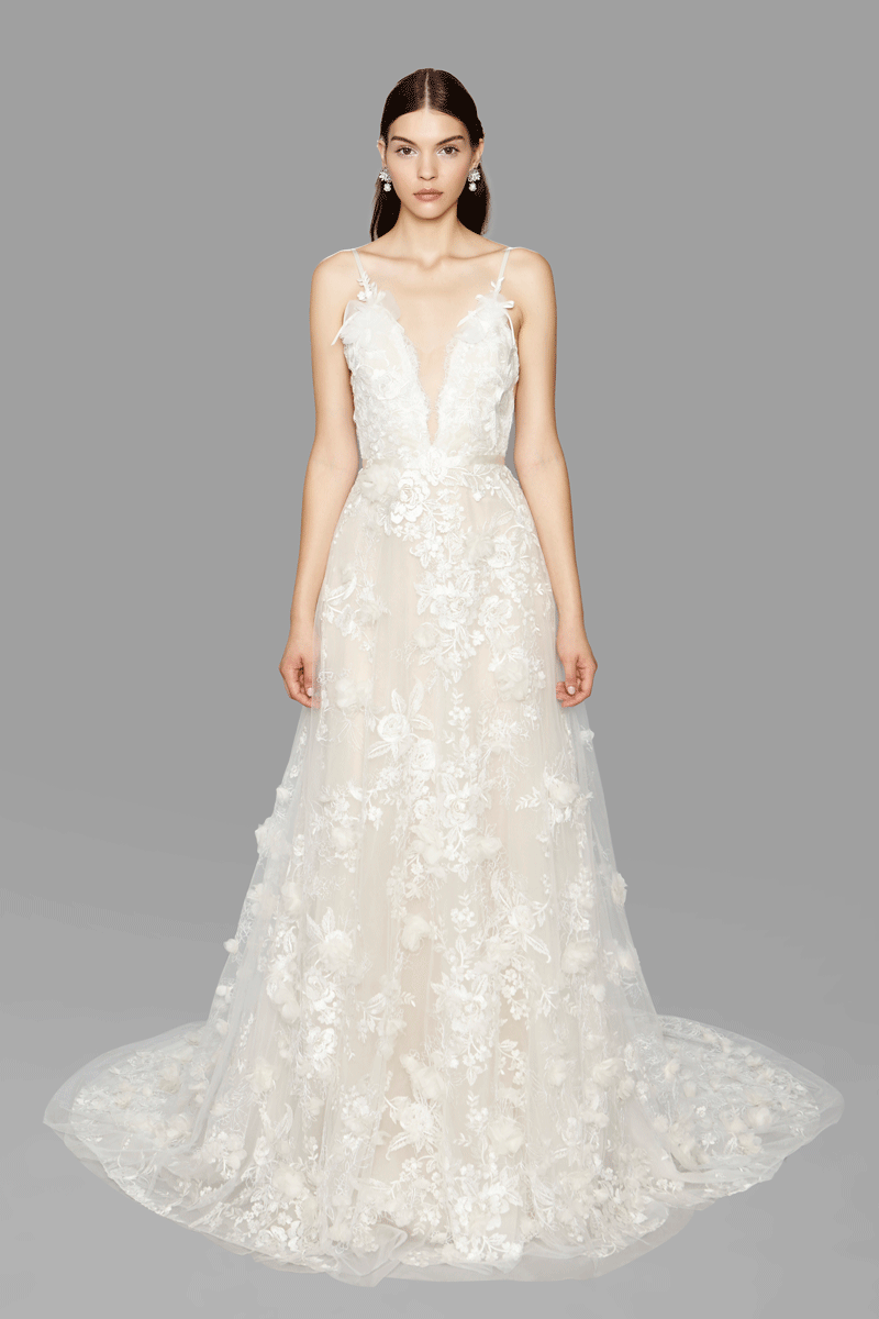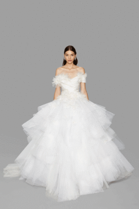 متوافرة لدى ESPOSA ، تغلب الفساتين الرومانسيّة الكاشفة للأكتاف ذات القصة الضيقة في الطبقة العلويّة والواسعة قليلاً تحت منطقة الخصر التي تضم الكورسيه الأنيق المموّج والمصنوع من حرير الأورجانزا. كما تبرز التطريزات ذات نقشة الأزهار على الأكمام المرفرفة بالإضافة إلى الدانتيل الشانتيي بألوانه النيود. وتتجلّى العذوبة والجمال والعناصر الشفافة واضحةً في الكورسيه الحريري المُصمّم بأناقة تامّة، في ما تضفي التنورة الطويلة من الخلف والقصيرة من الأمام والكاب القابل للإزالة والفصل لمسةً عصريّة لأسلوب أبدي في ما يتعلّق بأزياء الأعراس. ونلاحظ أيضاً الفساتين الدائرية والتول ذات الطبقات المتعدّدة والمشذّبة عند الأطراف والمطبوع عليها نقشة الأزهار. والفساتين ذات الخصر المنخفض وتلك المصمّمة من دون أكمام تتميّز جميعها بالقصات المفتوحة على الصدر والكاشفة للعنق والأطراف الجانبية التي تخلق وهماً. وتزيّن التطريزات ذات نقشة الأزهار الثلاثية الأبعاد فساتين الأعراس مع الحشوة المتعدّدة الطبقات والمنفوخة عندالمنطقة السفليّة من الخلف.