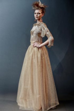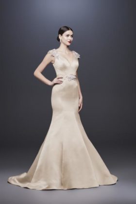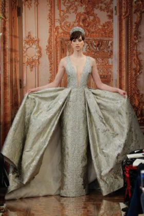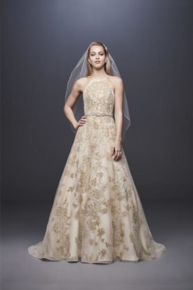 كما برز اللون الذهبي ودرجات الكريمي والعاجي في عدد من التصاميم والقصّات المختلفة، مثل فستان زفاف Galina Signature for David’s Bridal بتطريزات الذهبي، وفستان زفاف نعيم خان Naeem Khan بصيحة الشراشيب مع التنورة اللامعة.