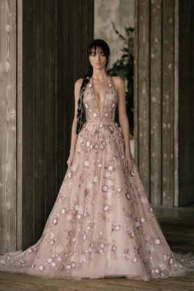 هناك العديد من الألوان التي ظهرت من قبل في فساتين الزفاف، وتستمر في عام 2019، مثل فساتين الزفاف الوردي، ولكن مع إضافة بعض اللمسات التي تمنحها فخامة، كالتطريزات البرّاقة والتفاصيل الملونة، مثل فستان زفاف Rivini.