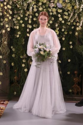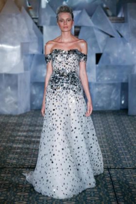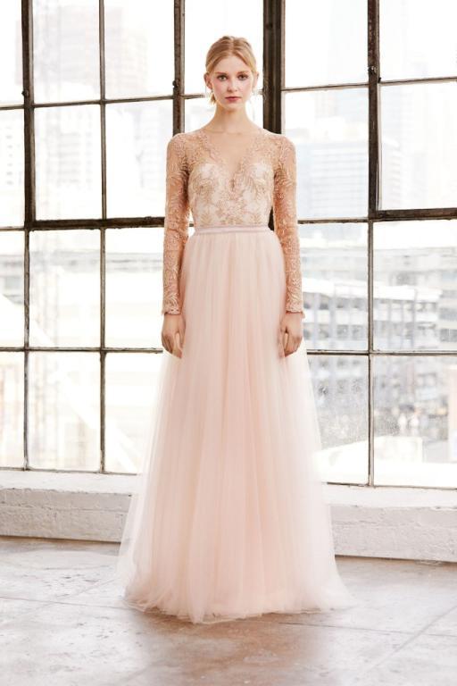 وقدمت ماركة برونوفياس Pronovias فستان زفاف نيود ناعم بتنورة أورغانزا، وبدرجة قريبة منه صممت ماركة Truly Zac Posen فستان ستان مزين بالتفاصيل البرّاقة.