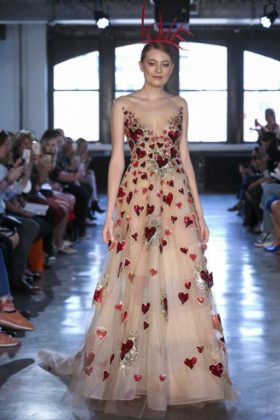 ولإطلالة جريئة ولافتة، قدمت دار واترز Watters فستان النيود المزين بالقلوب الحمراء.