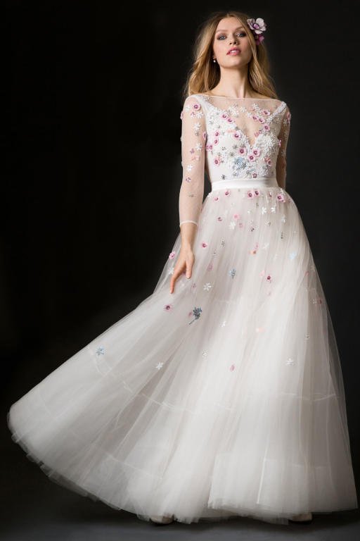 أما إذا كنتِ تفضلين اللون الأبيض، فيمكنك اختيار فستان زفاف كلاسيكي مزين بلمسات الألوان الحيوية، كـ فستان زفاف تيمبرلي لندن Temperley الأبيض مع الورود الصغيرة الملونة.