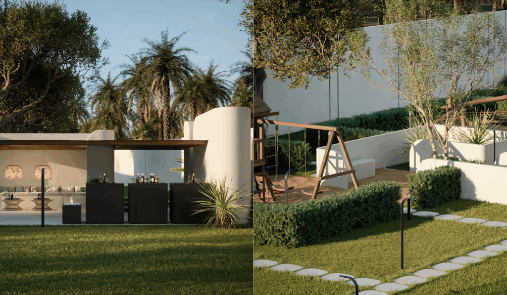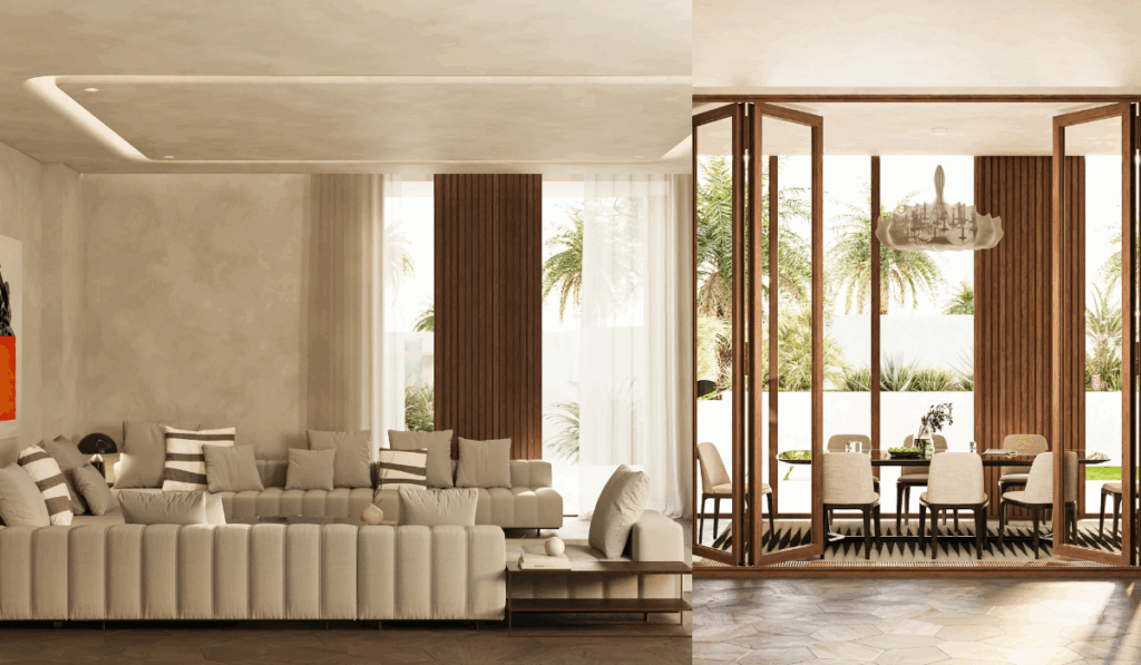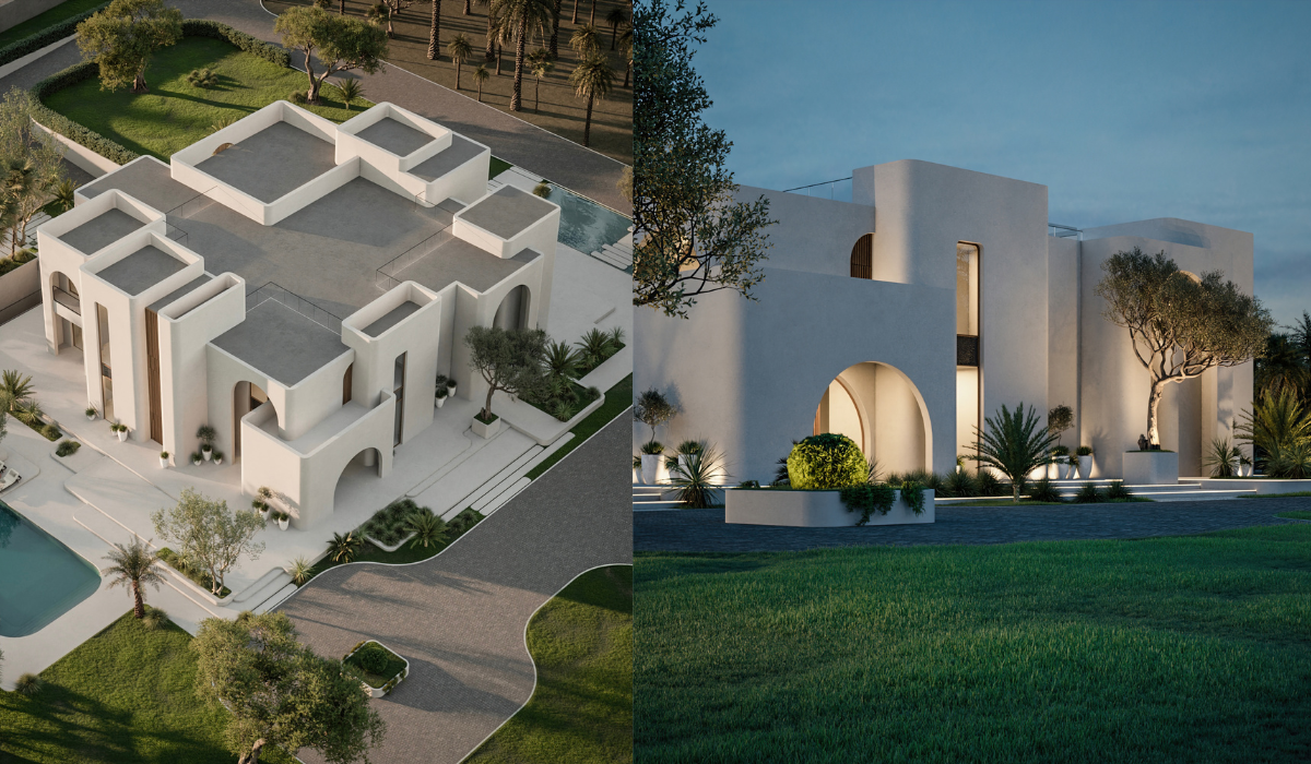 النوافذ في هذا المشروع ليست مجرد فتحات، بل تعمل كمداخل حقيقية تربط الداخل بالخارج، معززة بذلك التفاعل بين المساحات. معظم غرف الفيلا الرئيسية، المكوّنة من ثلاثة طوابق، تتمتع بإمكانية وصول مباشر إلى المساحات الخارجية.