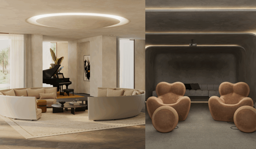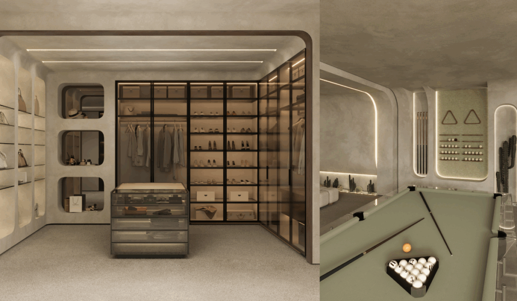 تتكون الفيلا الرئيسية من ثلاثة طوابق، وتضم وسائل راحة متعددة مثل: غرفة سينما، صالة رياضية، قاعة احتفالات، منطقة سبا، ساونا جافة، جاكوزي، وحمام تقليدي. بالإضافة إلى ذلك، تم تخصيص مساحة ورشة عمل للأشخاص المهتمين بالأنشطة الفنية.