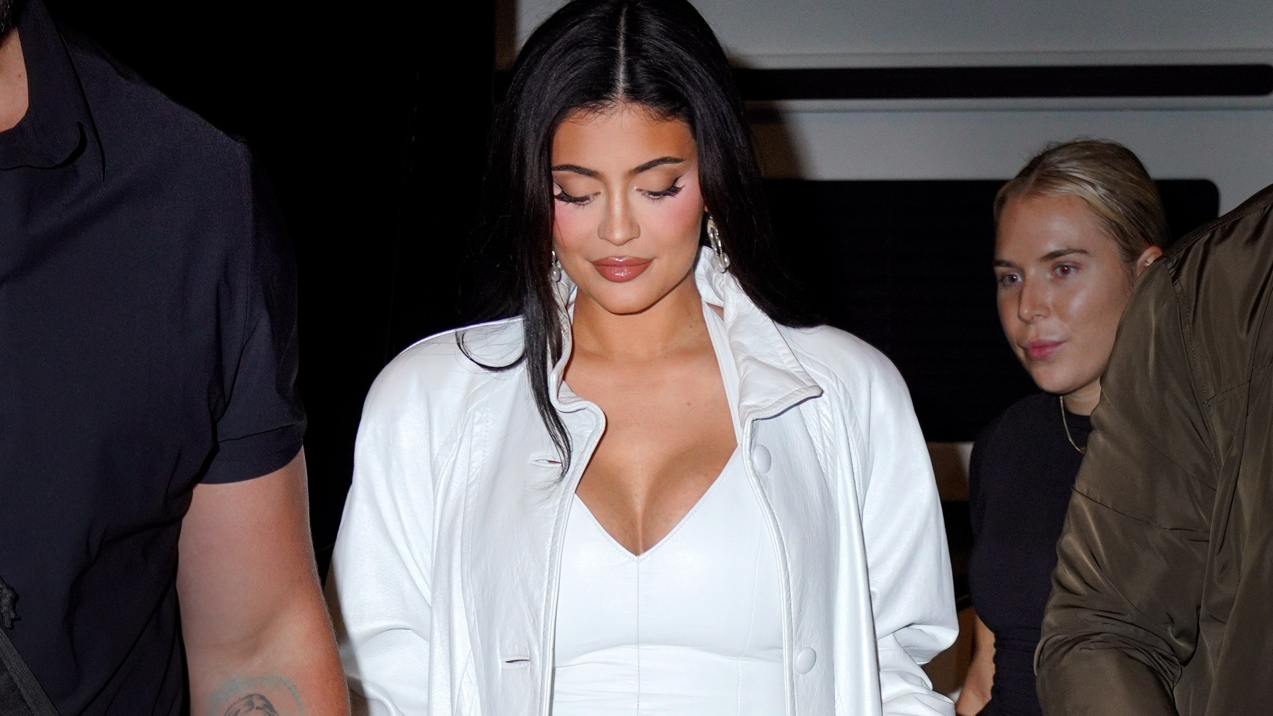 وإرتدت جينر خلال عشاء رومنسي حضرته، فستان أسود جلد وضيق فصل جسمها وبطنها المنتفخ.