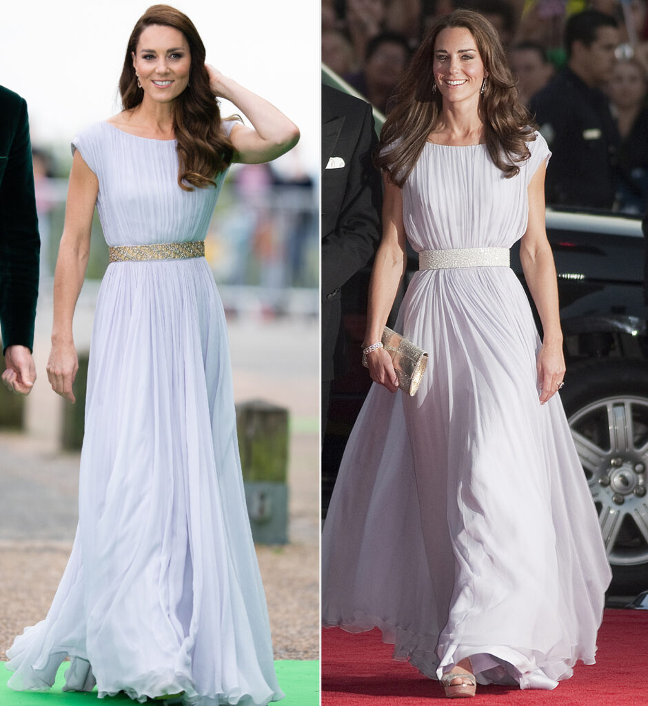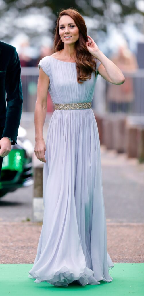 يتميز الفستان بقصّة طويلة منسدلة بتفصيل الثنيات الصغيرة، ومحدّد عند الخصر بحزام فضي مطرّز بالخرز الذهبي والفضّي، وقد أقرنته كيت بمجوهرات مرصّعة بالألماس والزمرّد، وانتعلت حذاءً فضياً بمنصّة ضخمة وكعب عال.