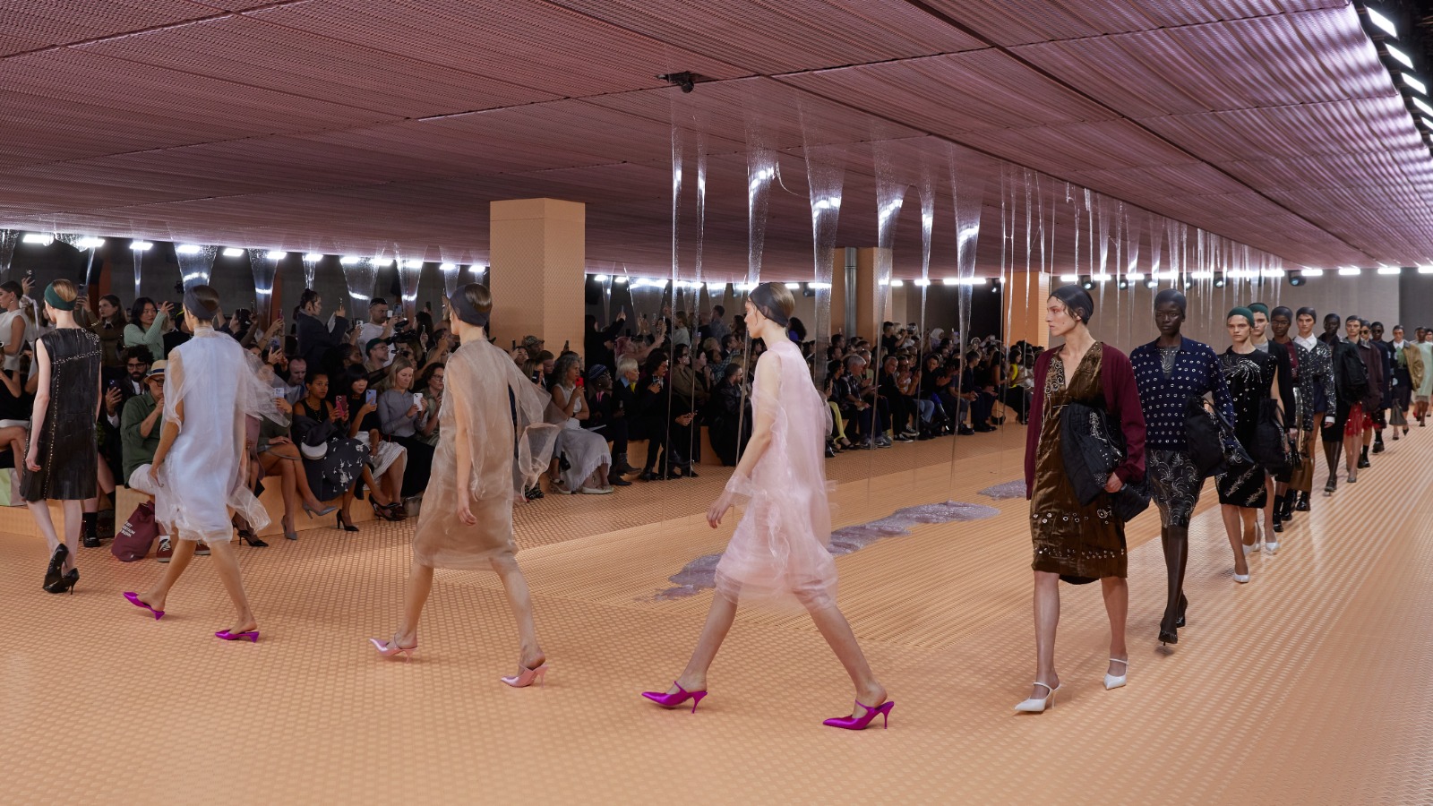 تقترح مجموعة برادا- Prada لربيع وصيف 2024 الحرية المطلقة للجسم، والتي تعكسها فساتين خفيفة الوزن التي تأتي من الأقمشة الفضفاضة لتتحدى لغة التصميم المفصل الكلاسيكي. يُعاد تقديم الشكل الرسمي، المستوحى من الملابس الرجالية، بأشكال معمارية تعكس الخطوط النموذجية لدقة الطابع الرسمي. يُعاد تقديم الحقائب والأحذية باستخدام خامات برادا الأيقونية، وتُزين باستخدام الجلود الفاخرة.