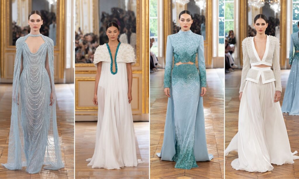 الأكمام الضخمة، والطبقات المعدنية، والدانتيل الشفاف تتصادم لتشكل أشكالا لا تطفو فقط، بل تأمر. اللوحة هي توازن قوي. الأزرق البارد والوردي الناعم لم يعودا هادئين، لكن مليئين بالطاقة. يتم موازنتهم بألوان العنبر الجريئة، والقرمزي العميق، ودرجات الوان الأرض المرسخة . هذه هي الأزياء الراقية التي تكرم الماضي بينما تخاطب الحاضر بجرأة.