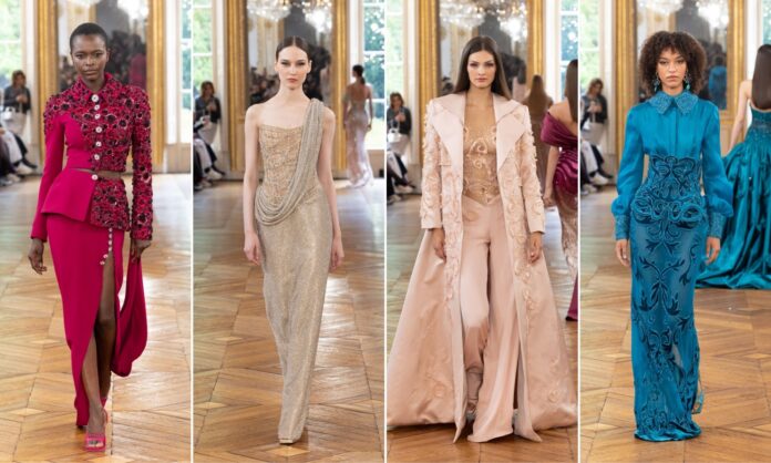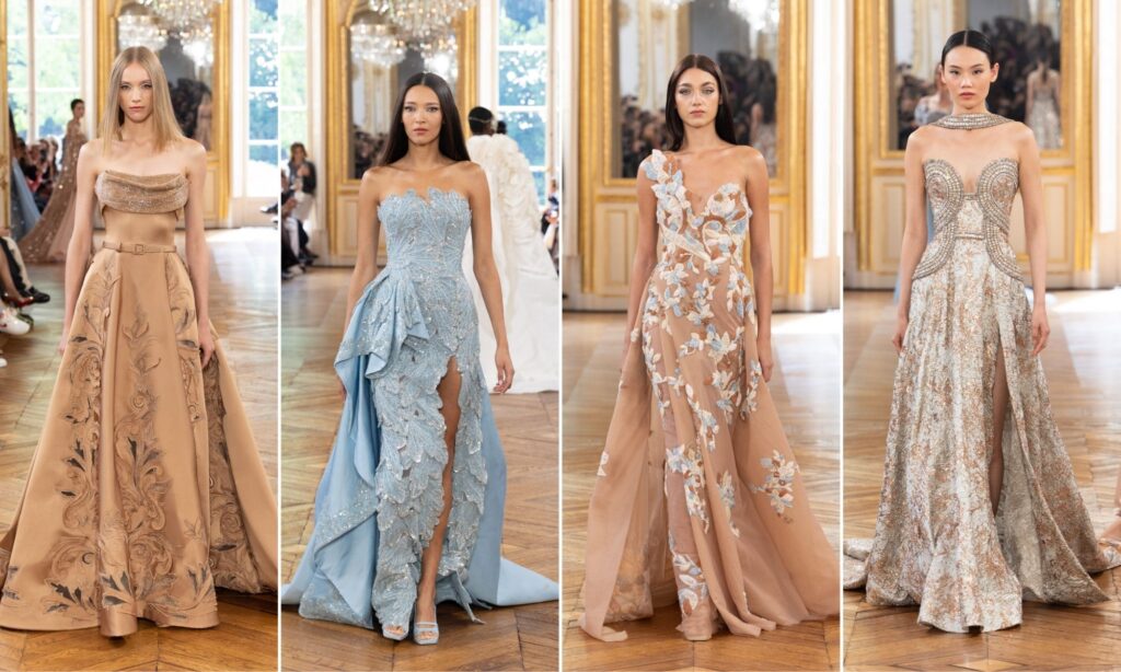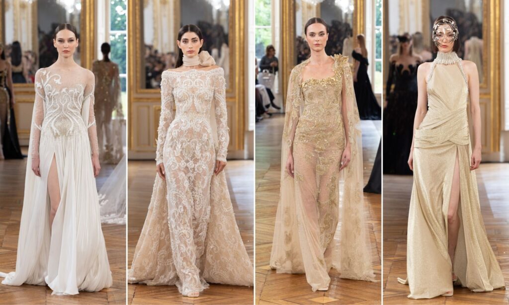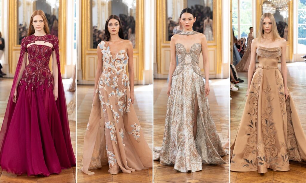 الأشكال الظلية أكثر قوة وحدّة. قصات المخمل المحروق والتطريز الباروكي الغني ينحت الجسم كالدرع. تنبثق الزخارف ثلاثية الأبعاد اليدوية من الخياطة، مما يعكس ما يجب أن يرى ويحس في آن واحد. اللآلئ لم تعد رقيقة؛ إنها تتعارض مع الشفافية وتبني الدراما . الكورسيه حاد ومقصود، يوفر هيكلا للأشكال السائلة والمثيرة.