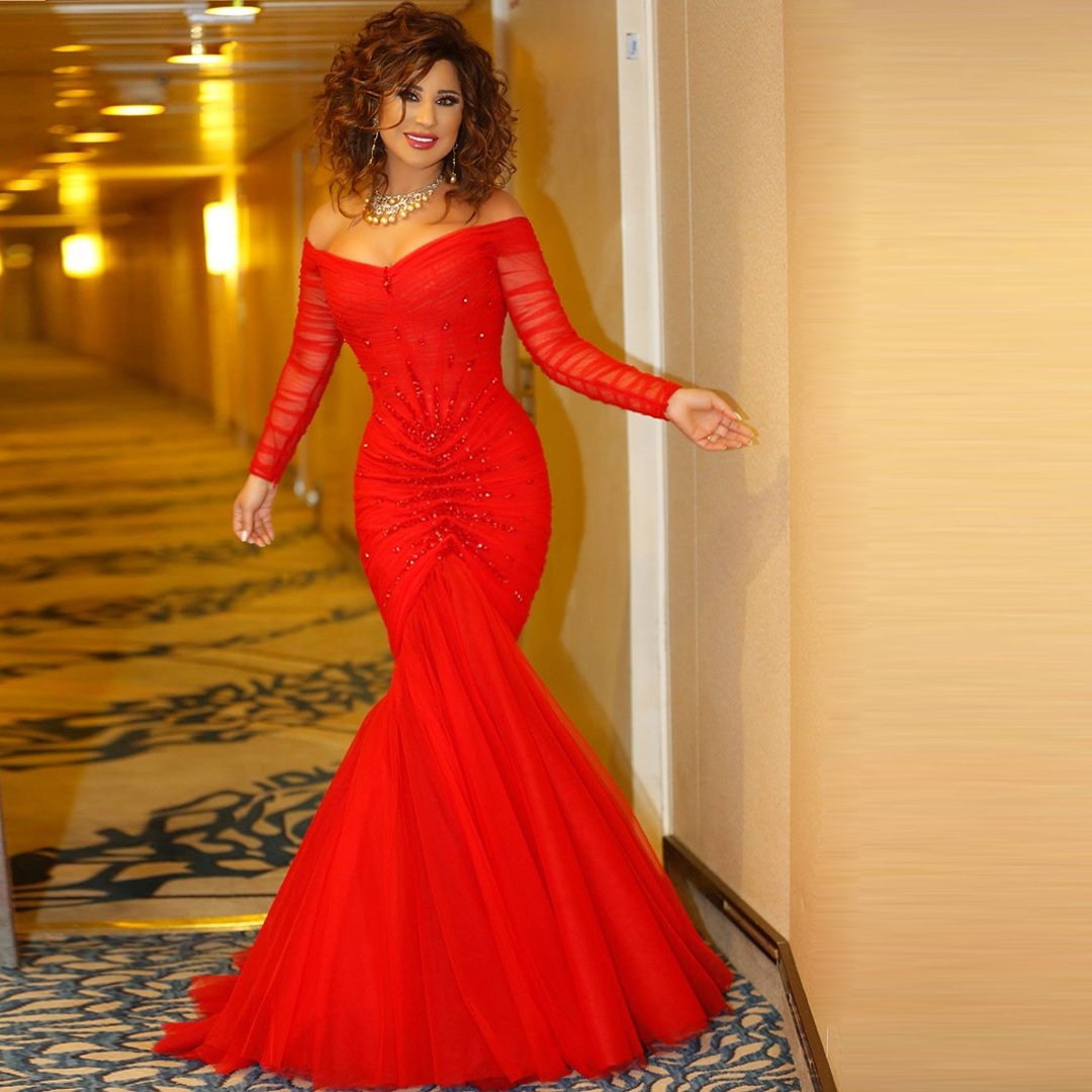 أمّا إطلالتها الثانية فكانت بفستانٍ أحمر اللون على شكل سمكة مكشوف الكتفين.