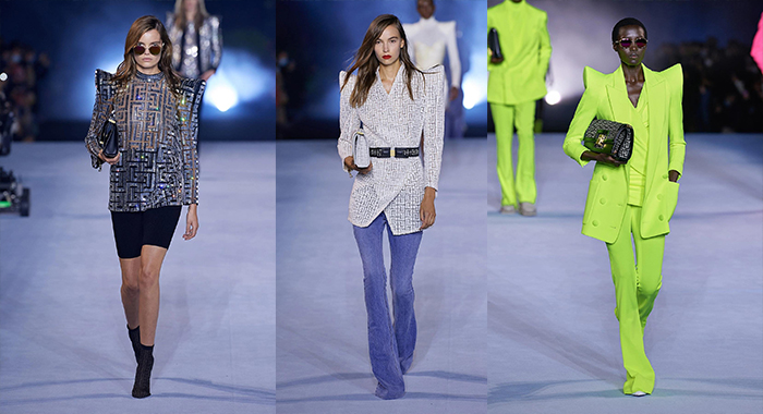 تؤكّد Balmain من خلال مجموعتها لربيع وصيف 2021، على أهمية التراث وكيف أن الوباء العالمي ساهم في تغيير مفهوم الموضة والصيحات، وقد برزت طبعة المونوغرام المشهورة بها الدار وهي حرفي P وB على كثير من التصاميم. لقد ضمّت المجموعة خيارات رائعة من البلايزر بالأكتاف المروّسة والسراويل القصيرة وتلك الضيّقة التي تتّسع من الأسفل والبزّات الرسمية، والأزياء المرصّعة بحبيبات السواروفسكي.