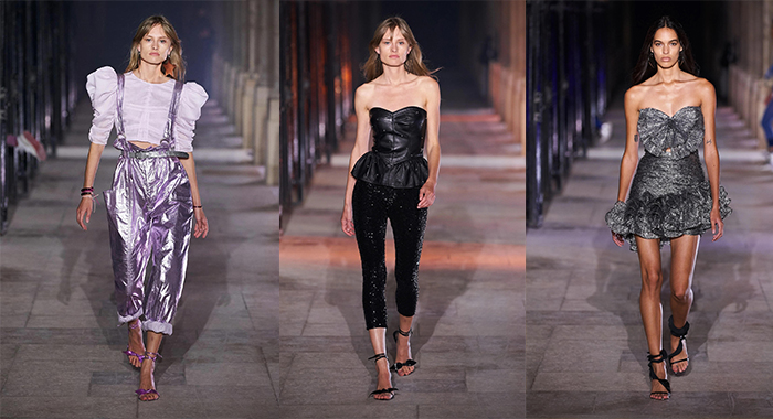 استوحيت مجموعة Isabel Marant من فترة الثمانينات وغلبت عليها اللمسات اللامعة التي تعدّ مثالية لأجواء السهرات. وضمت المجموعة السراويل القصيرة، بناطيل الجينز التي تم تنسيقها مع كروب توب وتنانير مرفقة بكشاكش. طغت على هذه القطع الألوان النابضة بالحياة مثل النيلي، الزهري والفضي، إلى جانب اللون الأسود وهو التدرّج الأساسي للسهرات والذي أتى مرصع بالحبيبات البراقة..