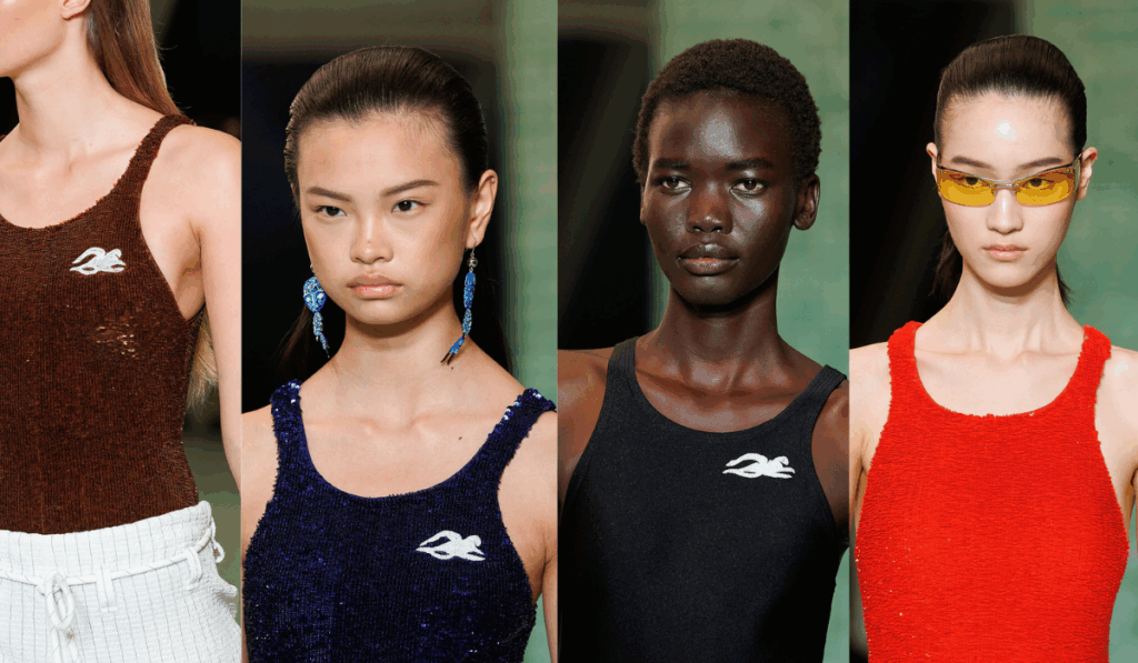 تتنوع قطع التشكيلة بين التصاميم الرياضية والفاخرة وتلك المميزة قصاتٍ مبتكرة، والتي أدخلت العلامة في إبداعها مجموعة من المواد والزخارف الأنيقة، بما يشمل القطن المبطن والصوف المُحاك بنمط وافل إلى جانب الصوف القابل للتمدد والترتر المجدول يدويًا وتطريزات الكريستال والجلد الفاخر خفيف الوزن. وتحاكي نقشات الجاكار عالم السباحة والأمواج، في حين يمنح قماش توال دي جوي المميز بمظهره الكلاسيكي طابعًا مستوحى من الكائنات الفضائية.