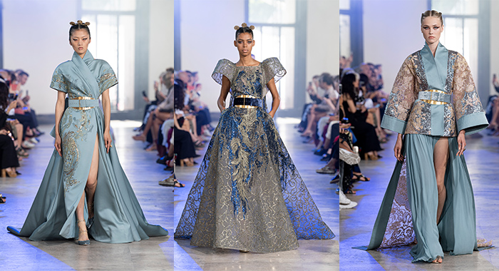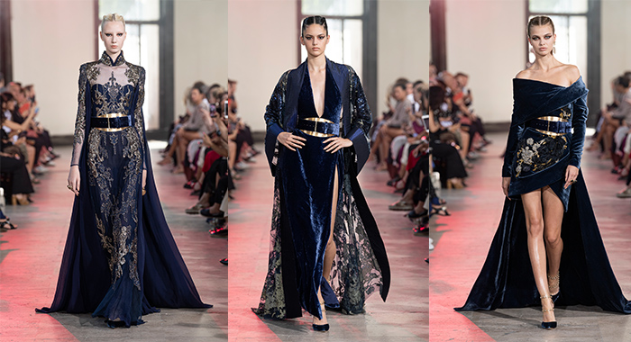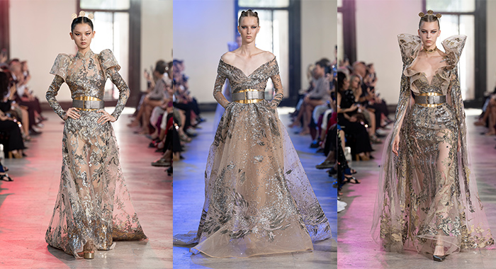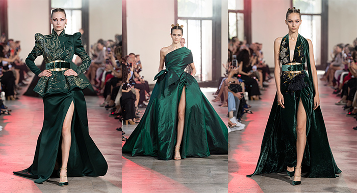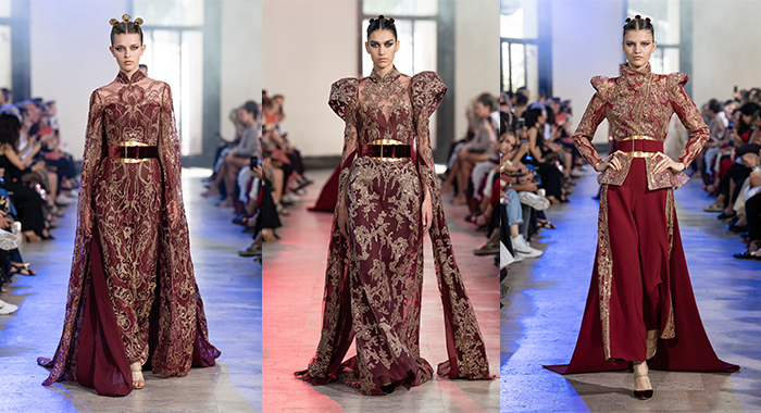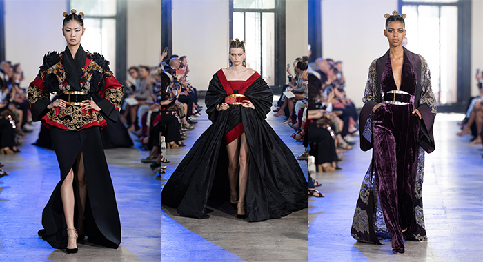 وتتأنقّ الإطلالات بسترات مزخرفة، وقصّات الكیمونو، والأكمام الفضفاضة، والكابات الملكیة، والتصامیم المنھدلة بسخاء. ویتجلىّ البذخ الإمبراطوري في ألوان الأحمر القاني والذھبي وأقمشة المخمل والساتان والتافتا المتدفقّة والمزیّنة بالریش والتول، مع ربطات كبیرة عند الخصر، كلّ ذلك في تناغم مع شفافیة أنثویة تعكس لعبة الضوء والظلّ، وتمنح الإطلالات المزید من النور ولمسة أسطوریة خالدة.