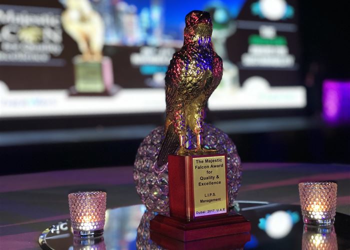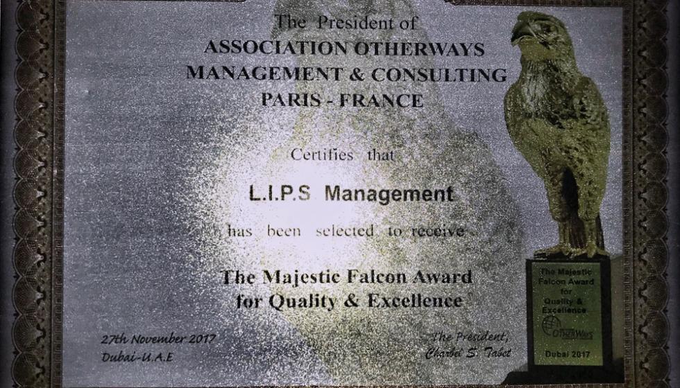 تميزت شركة L.I.P.S. Management للمرة الثالثة في أقل من شهرين بالحصول على عدة جوائز واليوم حصلت على جائزة الـMajestic Falcon Award للتمييز والجودة في التنظيم والاداء على مستوى عالمي من قبل شركة Otherways Association – فرنسا، ولك خلال حفل عشاء فخم تم توزيع الدروع فيه، أقيم في فندق الجي دبليو ماريوت ماركيز – دبي.