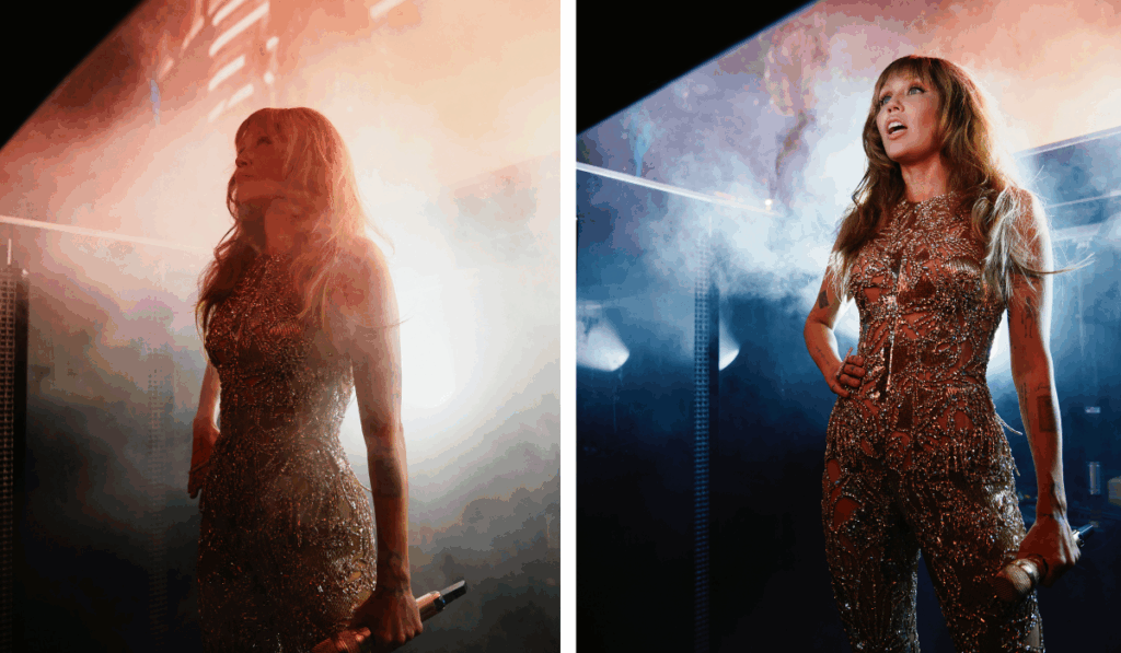 تألّقت مايلي سايرس بجمبسوت فاخر مصنوع من التول البيج، مطرّز يدويًا بالكريستال الذهبي، وحبيبات الترتر بتفاصيل فنية مستوحاة من رسومات الوشوم بتقنية الستنسل.