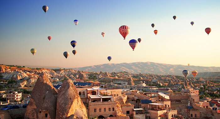 1- كابادوكيا: تشتهر هذه الوجهة بمناظرها الطبيعية الفريدة، والتي يمكن استكشافها من خلال القيام برحلة على متن المنطاد.