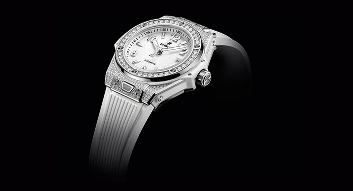 لفتح آفاق أكثر سعادة والتبشير بغدٍ أفضل، تطلق Hublot ساعة Big Bang One Click 33mm، المتوافرة بإصدار من الفولاذ المقاوم للصدأ وآخر من ذهب King Gold، مع سبعة أحزمة قابلة للتبديل، لتلائم مزاج المرأة مهما تبدّل ومختلف إطلالاتها. تتنوّع تصاميم الأحزمة المطاطيّة ما بين الحزام الملائم لملابس السهرة وذاك الأسود البسيط والأزرق الملكيّ والأبيض، إضافة إلى تلك الزهريّة والأزرق السماويّ والأخضر والأحمر والبرتقاليّ. تتميّز هذه الساعة بإطارها المرصّع بالماس، وقد زُوّدت بنظام التثبيت One Click المسجّل ببراءة اختراع والذي يسمح بتبديل مظهر الساعة بمجرّد ضغطة. كذلك، جُهّزت بآليّة الحركة الذاتيّة التعبئة HUB1120، وتتميّز بنافذة للتاريخ قرب موضع الساعة ٣. أمّا تردّدها فيبلغ 28,800 ذبذبة في الساعة، على مدى أكثر من 40 ساعة متواصلة.