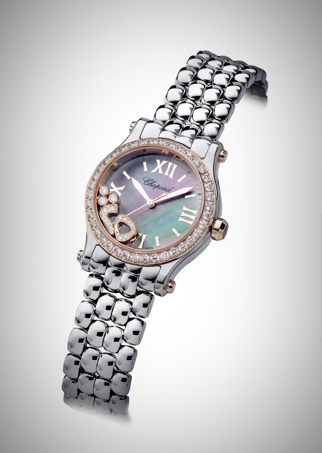 في عام 1993، افتتحت Chopard أول صالة عرضٍ لها في الإمارات العربية المتّحدة وتحديدًا في مركز “وافي” الواقع في دبي مول، متيحة لعشّاقها فرصة استكشاف أجمل إبداعاتها الفاخرة. وفي العام ذاته، أطلقت مجموعة ساعات Happy Sport المميزة بسوار ذي حبوب متراصفة من الفولاذ الصلب المقاوم للصدأ، والتي كانت أوّل ساعة تصمّمها المديرة الإبداعية للدار والرئيسة الشريكة فيها، السيدة Caroline Scheufele. ولأنّ الذكرى الخامسة والعشرين لإطلاق هذه المجموعة تصادف في العام نفسه لافتتاح أوّلى متاجر Chopard في الإمارات العربية المتّحدة، أطلقت هذه الأخيرة إصدارًا خاصًا بدبي ومحدودًا بـ 25 ساعة استوحته من التصميم الأساسي لأوّل ساعة Happy Sport. تتميز الساعة الجديدة بإطار من الذهب الورديّ والمرصّع بالألماس، وبميناء مصنوع من عرق اللؤلؤ التاهيتي يجمع بين لوني الأزرق والزهري بأسلوب آسر. ولتجسيد هذه الذكرى بطريقة استثنائية، تمّ تصميم رقمي 2 و5 بلغة الـ Urdo من الذهب الورديّ والألماس، وأضيفا فوق الزجاجة بين مؤشري الساعة السادسة والتاسعة.