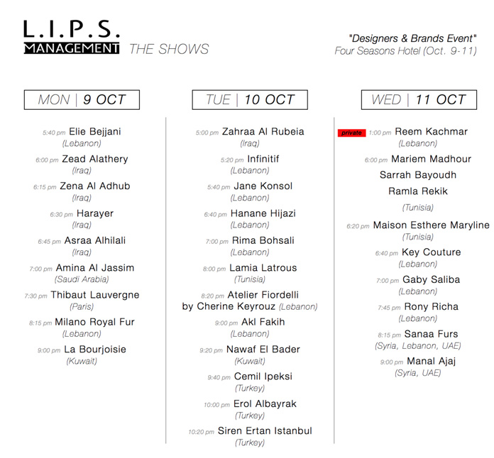 الجدير بالذكر ان فعاليات عروض Designers & Brands Fashion Shows ستقام من تاريخ ٩ ولغاية ١١ اكتوبر ٢٠١٧ في القاعة الكبرى في الFour Seasons Hotel-Beirut.