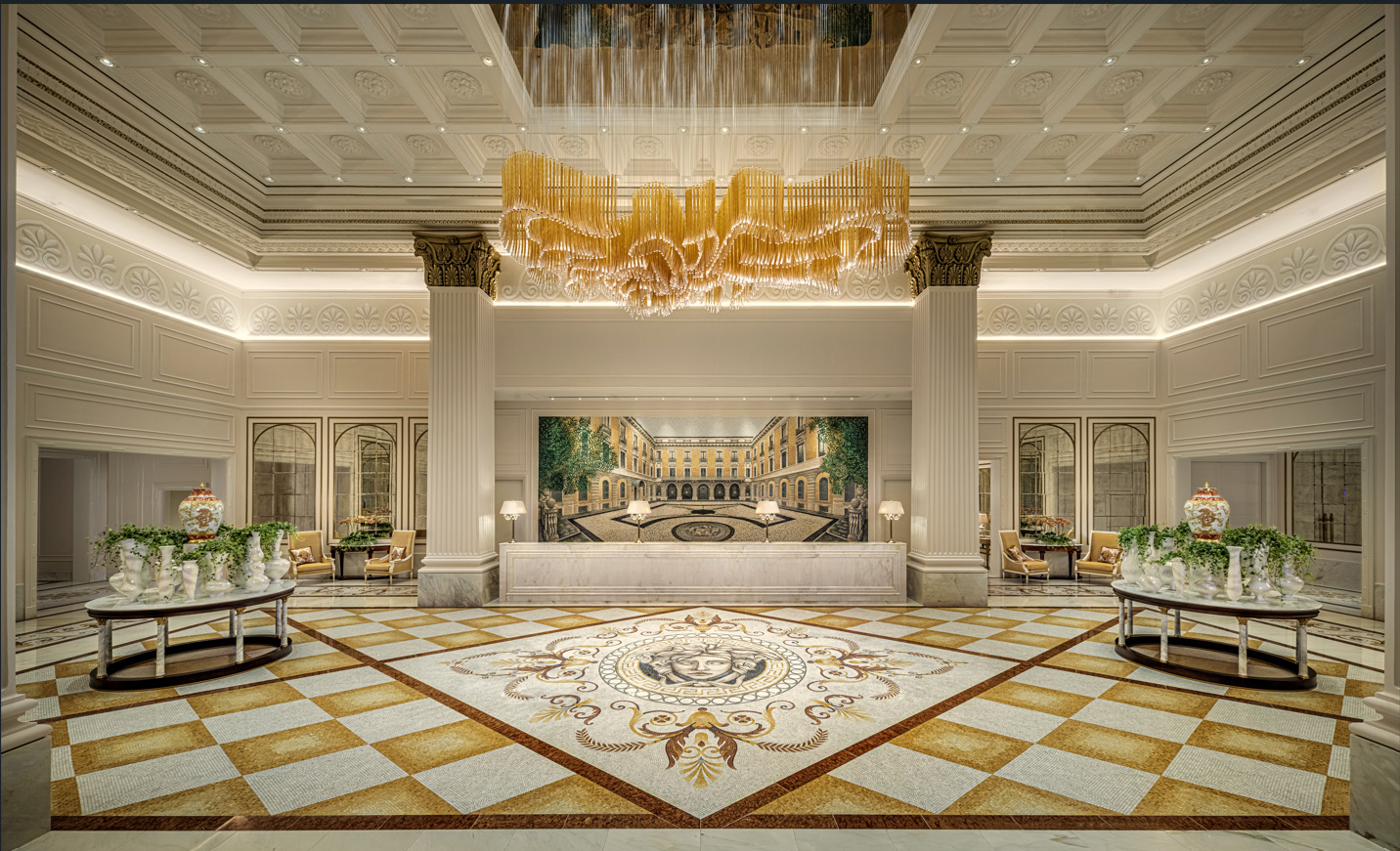 زيارتُك لفندق Palazzo Versace تحملك إلى عالم الأسلوب الفاخر المميز للدّار لتحيط بك رموزها الرائعة. يذكّرك الفندق بنمط القصر الإيطالي، كما يتجلّى أمامِك إرث فيرساتشيميلانو وذوقه المميز. يتمّ الترحيب بالضيوف في الرُّدهة الفسيحةمن خلال تفاصيل تمثّل وبشكل رائع منزل فيرساتشي في ميلانو- القصر في شارع Via Gesù 12 الذي يضمُّ Versace Atelier – المصنوع من أكثر من 80.000 بلاطة فسيفساءمشغولة يدويًا. تم تجسيد كل من رأس Medusaالذي يرمز إلىالدار، والزخارف اليونانية الهندسية، وطبعة الباروك في إنهاءاتٍحرفية متنوعة – كالمنحوتات الزخرفية، والسجاد، كما تمّ دمجهافي أرضيات التيرازو والفسيفساء. يمزج التّصميم الفريد لفندقPalazzo Versace Macau بين هذه الجماليّة الإيطاليةوالرموز المتجذّرة في التقاليد الصينية المحلية – زهرة الأقحوانوالتنين المزخرف – والتي تظهر في جميع أنحاء الفندق.