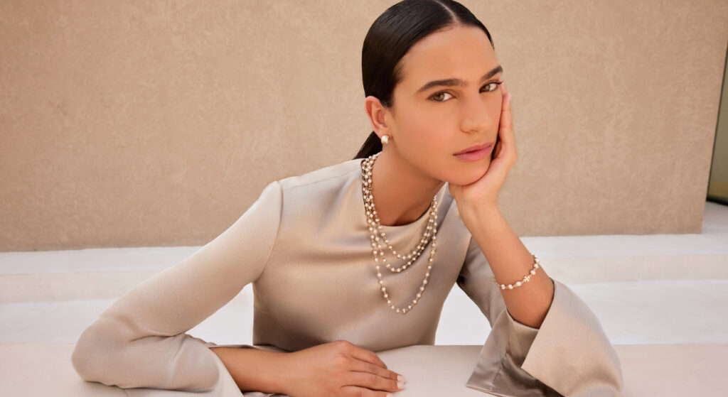 كما يبرز في القطع مجموعة خلابة من المجوهرات المشرقة بتدرجات الذهبي اللامع والنحاسي الفاتح، يتألق بعضها بتفاصيل مضيئة باللؤلؤ، إضافة إلى ساعة فريدة تكشف عن ميناء وردي غير لامع وسوار كلاسيكي ثنائي اللون، مما يتيح إكسسوارات مثالية تليق بجلسات الإفطار والسحور.